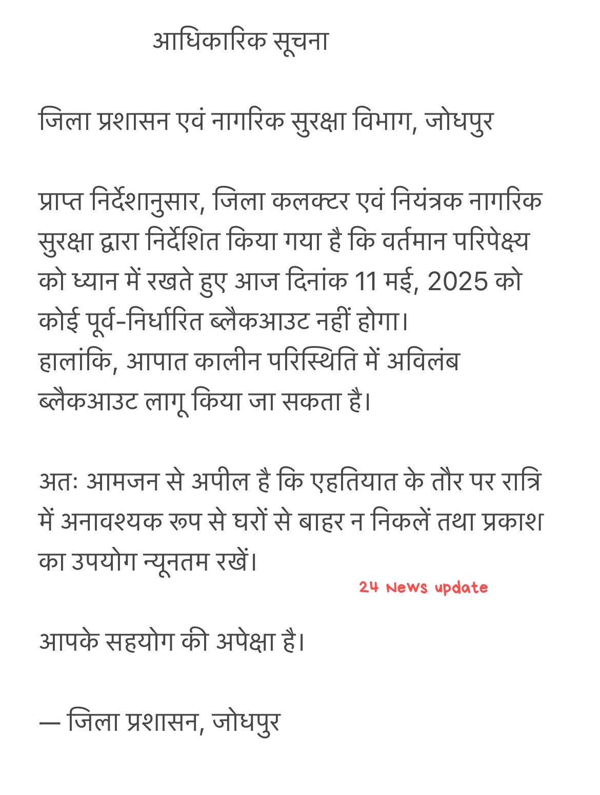 जोधपुर में स्थिति सामान्य, प्रशासन ने ब्लैकआउट रद्द किया; सीमा पर सतर्कता जारी 24 न्यूज अपडेट, जोधपुर। जोधपुर जिला प्रशासन और नागरिक सुरक्षा विभाग ने आज (11 मई, 2025) स्पष्ट किया कि आज रात कोई निर्धारित ब्लैकआउट नहीं होगा। हालांकि, प्रशासन ने चेतावनी दी है कि यदि कोई आपात स्थिति उत्पन्न होती है, तो अचानक ब्लैकआउट लागू किया जा सकता है। जिला कलक्टर और नागरिक सुरक्षा नियंत्रक ने नागरिकों से अनुरोध किया है कि वे रात में अनावश्यक रूप से घरों से बाहर न निकलें और प्रकाश का उपयोग कम से कम करें। सीजफायर के बावजूद सतर्कता बरती जा रही है कल दोपहर जारी किए गए रेड अलर्ट और बाजार बंद होने के बाद आज शहर में हालात धीरे-धीरे सामान्य हो रहे हैं। हालांकि, पाकिस्तान की ओर से सीजफायर का उल्लंघन किए जाने के कारण सुरक्षा एहतियात बरकरार रखे गए हैं। कल रात 12 बजे से सुबह 4 बजे तक ब्लैकआउट लागू रहा, जिसमें जोधपुर डिस्कॉम ने पूरे शहर की बिजली आपूर्ति बंद रखी। सुबह 4:30 बजे बिजली बहाल की गई। इस दौरान अधिकांश नागरिकों ने स्वेच्छा से अपने घरों में इन्वर्टर से चलने वाली लाइटें भी बंद रखीं। पुलिस की सख्त निगरानी कुछ घरों में बाहर की लाइटें जलने की शिकायतें पुलिस कंट्रोल रूम तक पहुंचीं, जिस पर तुरंत कार्रवाई करते हुए पुलिस टीमों ने मौके पर पहुंचकर लाइटें बंद करवाईं। पुलिस ने पूरी रात गश्त लगाकर सुरक्षा व्यवस्था को चाक-चौबंद बनाए रखा। शांति बनी हुई, प्रशासन सतर्क वर्तमान में शहर में पूर्ण शांति बनी हुई है और स्थिति नियंत्रण में है। प्रशासन लगातार हालात पर नजर बनाए हुए है और आवश्यकता पड़ने पर तत्काल कार्रवाई के लिए तैयार है। नागरिकों से सहयोग की अपील की गई है और उन्हें किसी भी संदिग्ध गतिविधि की सूचना तुरंत प्रशासन को देने के लिए कहा गया है। Share this: Share on X (Opens in new window) X Share on Facebook (Opens in new window) Facebook More Email a link to a friend (Opens in new window) Email Share on WhatsApp (Opens in new window) WhatsApp Like this:Like Loading... Related Discover more from 24 News Update Subscribe to get the latest posts sent to your email. Type your email… Subscribe Post navigation झुंझुनूं के वीर सुरेंद्र का बलिदान: उधमपुर में पाक हमले में शहीद, पत्नी की हालत नाजुक ब्लैकआउट के बाद कट्टे में मिले महिला के शव मामले में दो गिरफ्तार