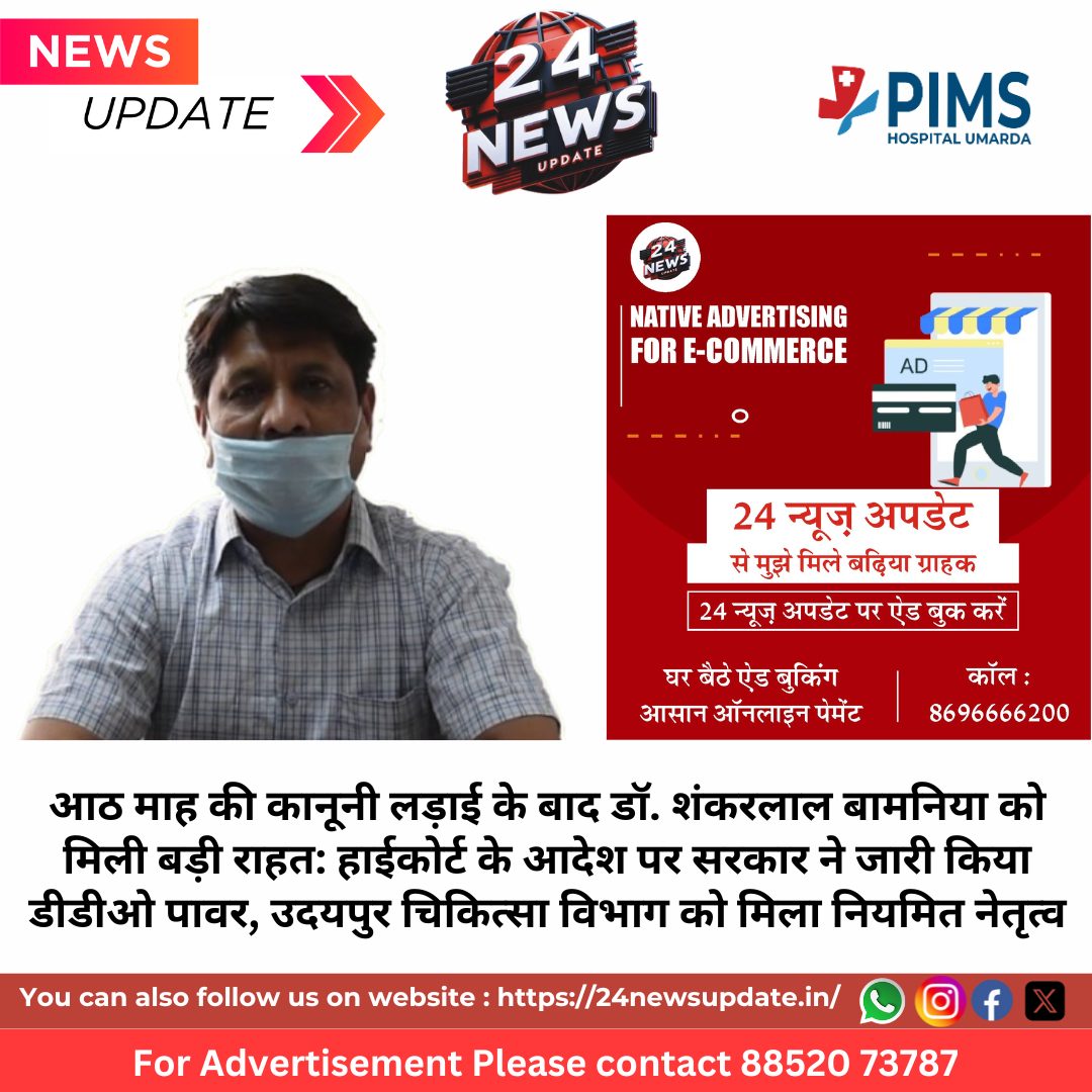 24 news Update उदयपुर। लगभग आठ माह तक खाली पड़े उदयपुर जिले के मुख्य चिकित्सा एवं स्वास्थ्य अधिकारी (सीएमएचओ) पद पर अब स्थायी रूप से डॉ. शंकरलाल बामनिया कार्यरत रहेंगे। राजस्थान हाईकोर्ट जोधपुर खंडपीठ के आदेशों की अनुपालना करते हुए शनिवार को चिकित्सा एवं स्वास्थ्य सेवाएं निदेशालय, जयपुर ने उन्हें आहरण एवं वितरण अधिकारी (डीडीओ) पावर जारी कर दिया। इस फैसले से न केवल लंबी कानूनी लड़ाई का पटाक्षेप हुआ बल्कि उदयपुर चिकित्सा विभाग को भी महीनों बाद नियमित नेतृत्व प्राप्त हो गया।