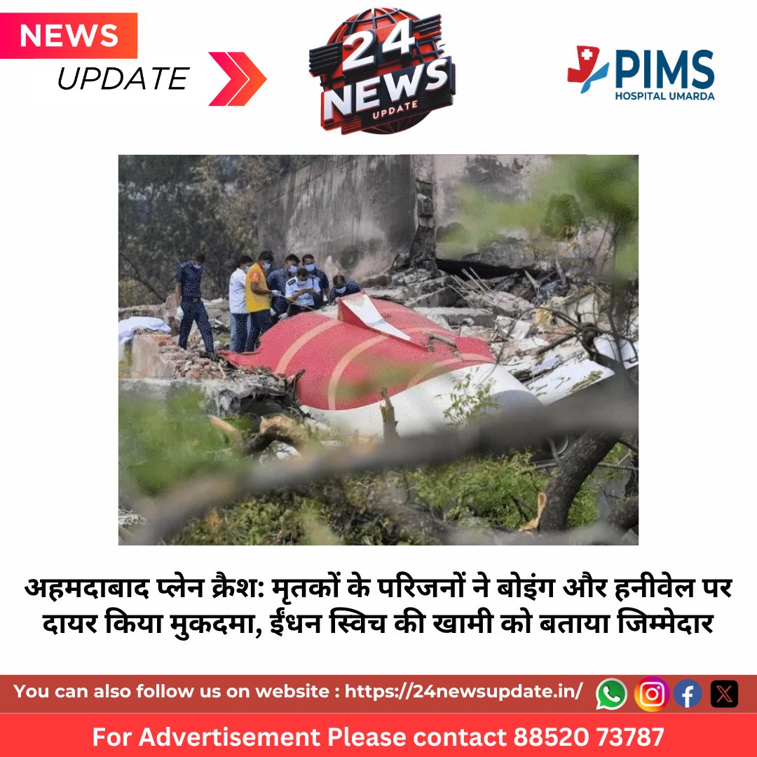 24 न्यूज अपडेट, उदयपुर। अहमदाबाद में 12 जून को हुए विमान हादसे में मारे गए चार यात्रियों के परिवारों ने अब अमेरिका में विमान निर्माता कंपनी बोइंग और पुर्जे सप्लाई करने वाली कंपनी हनीवेल के खिलाफ मुकदमा दायर किया है। यह मुकदमा टेक्सास की लैनियर लॉ फर्म के जरिए दाखिल किया गया।