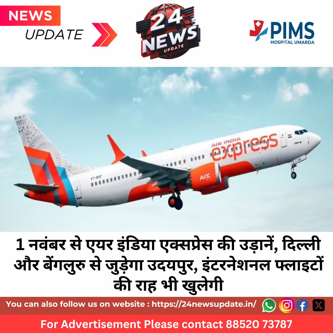 24 News Update उदयपुर। झीलों की नगरी की हवाई कनेक्टिविटी अब और मजबूत होने जा रही है। एयर इंडिया एक्सप्रेस पहली बार उदयपुर से अपनी सेवाएं शुरू कर रही है। एयरलाइन ने 1 नवंबर 2025 से दिल्ली–उदयपुर और बेंगलुरु–उदयपुर के बीच दो नई फ्लाइटों की घोषणा की है।