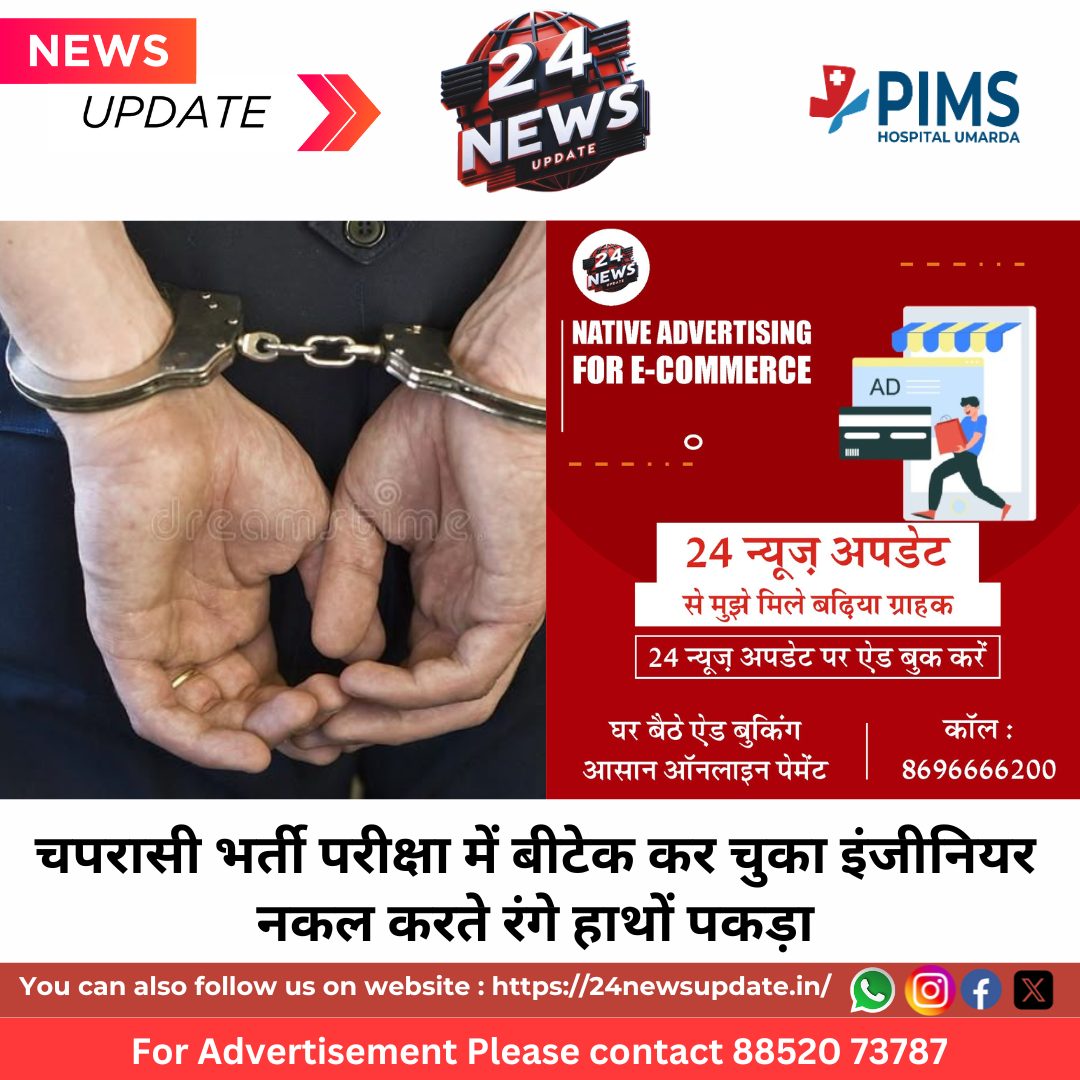 24 News Update जयपुर। राजस्थान चतुर्थ श्रेणी (चपरासी) भर्ती परीक्षा में नकल करने का मामला सामने आया है। खंडेला निवासी इंजीनियर रवि झाझरिया (25) को अशोक नगर स्थित महात्मा गांधी गवर्नमेंट स्कूल परीक्षा केंद्र में नकल करते हुए गिरफ्तार किया गया।