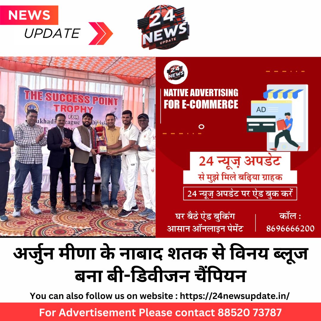 24 न्यूज अपडेट. उदयपुर। उदयपुर जिला क्रिकेट संघ के तत्वाधान में द सक्सेस पॉइंट मोहनलाल सुखाड़िया लीग डिवीजन चैंपियनशिप के फाइनल मैच में विनय ब्लूज ने अर्जुन मीणा के नाबाद शतक की बदौलत वेटरस क्रिकेट क्लब को 7 विकेट से हराकर द सक्सेस पॉइंट मोहनलाल सुखाड़िया लीग बी डिवीजन पर कब्जा किया।