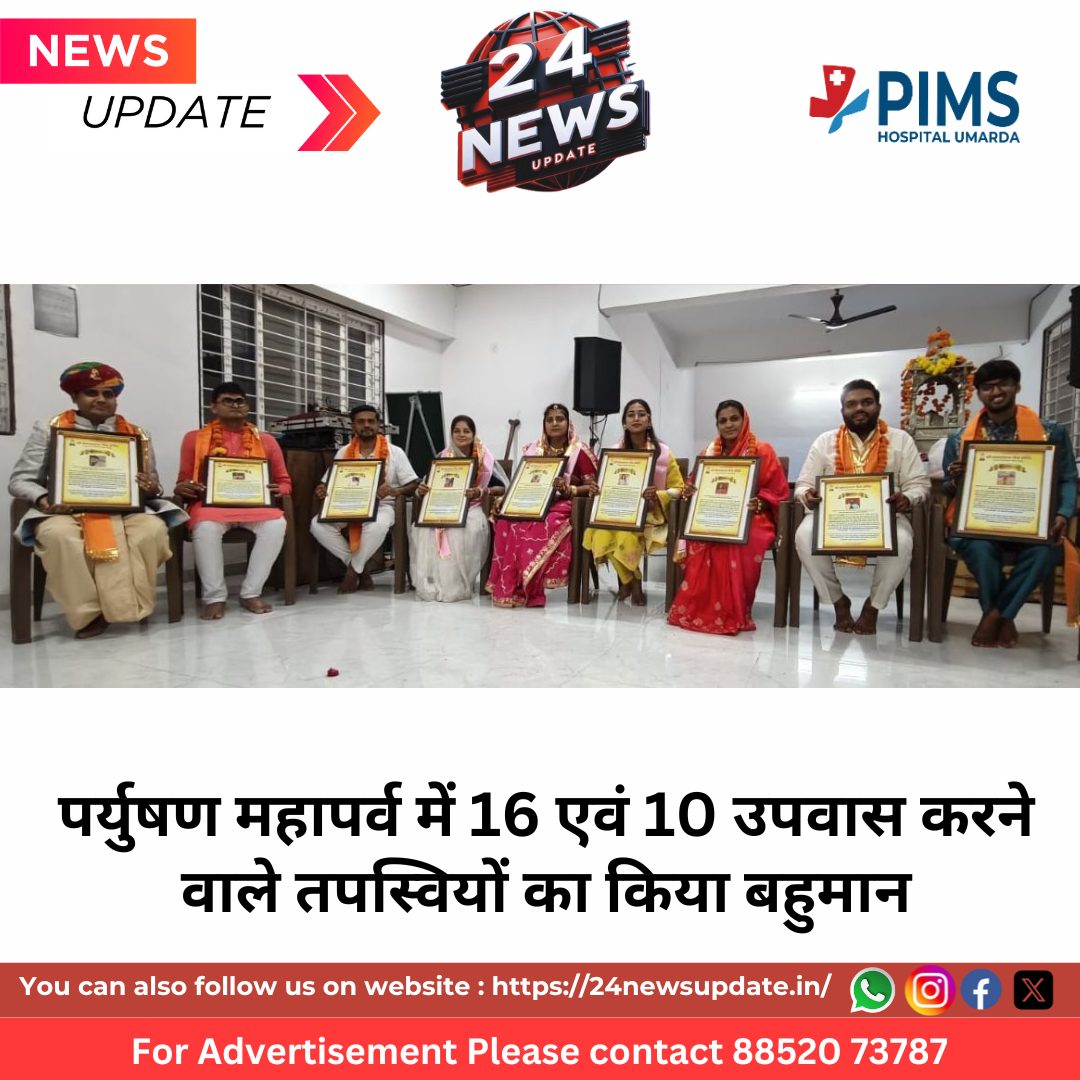 24 News Update उदयपुर। सवीना खेड़ा स्थित सम्भवनाथ कॉम्प्लेक्स सोसाइटी चैत्यालय में पर्युषण महापर्व अत्यंत श्रद्धा, भक्ति और उत्साह के साथ मनाया गया। संभवनाथ सोसायटी सचिव सचिन शाह ने बताया कि जिसमें श्रीजी की पालकी यात्रा, भक्ति संध्या, रथ यात्रा, तपस्वी सम्मान और स्वामी वात्सल्य जैसे आयोजन भव्य रूप से सम्पन्न हुए। निशा जैन व अनीता संतोष वकावत का 16 उपवास (तप जारी) एवं संतोष, मांगीलाल वकावत, जय कमलेश नागदा, मीना सुरेश गदावत, विशाल चंचल कोठारी, आयुषी दिलीप आसावत व रुपेश कारूलाल पचौरी के 10 उपवास की तप आराधना पर सोसाइटी द्वारा 1008 श्री सम्भवनाथ भगवान की पालकी यात्रा के दौरान भावपूर्ण सम्मान व प्रशस्ति भेंट की गई। चैत्यालय के पुष्कर जैन भदावत ने बताया कि सभी तपस्वियों ने अपने तप अनुभव साझा कर समाज को प्रेरणा दी। दस उपवास की तपस्या करने वाली युवा आयुषी जीअसावत ने कहा कि मन की शांति एवं आराम के लिए गोवा-मनाली की यात्रा की नहीं,वरन प्रभु की भक्ति और तप ही सच्चा सुख एवं सकुन प्रदान करता है। ईस अवसर पर श्वेताम्बर समाज के तपस्वी चिराग सामर ने कहा कि जैन समाज की एकता का परिचय यह संभवनाथ सोसायटी प्रदान करती है। गाजे-बाजे के साथ निकली पालकी यात्रा, वर घोड़े की शोभा, शांति धारा, आरती व सामूहिक स्वामी वात्सल्य के साथ यह आयोजन अत्यंत सफल रहा। समिति सदस्यों ने समस्त अतिथियों, तपस्वियों और समाजजनों का आत्मीय स्वागत कर सोसाइटी की गरिमा को बढ़ाया।