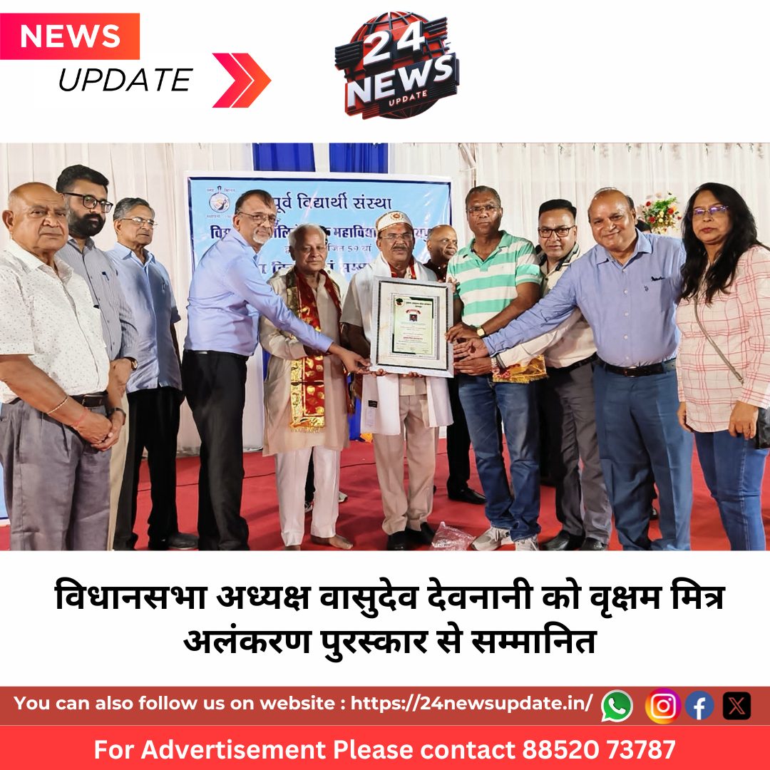 24 News Update उदयपुर . पूर्व विद्यार्थी संस्था के स्थापना दिवस और सिल्वर जुबली कार्यक्रम में विधानसभा अध्यक्ष राजस्थान सरकार वासुदेव देवनानी को पर्यावरण के क्षेत्र मे आप द्वारा किए गए उत्कृष्ट कार्य हेतु वृक्षम अमृतम द्वारा वृक्षम मित्र अलंकरण पुरूस्कार द्वारा सम्मानित किया गया। संरक्षक मनोहर लाल व्यास, अध्यक्ष गोपेश शर्मा, उपाध्यक्ष अनिल पारिक, सचिव यशवंत त्रिवेदी, कोषाध्यक्ष रमेश चोरड़िया, वरिष्ठ सदस्य कन्हैयालाल और गायत्री श्रीमाली द्वारा पगड़ी, शोल, उपरणा व स्मृति चिन्ह भेंट कर वृक्षम मित्र अलंकरण पुरस्कार द्वारा सम्मानित किया गया l