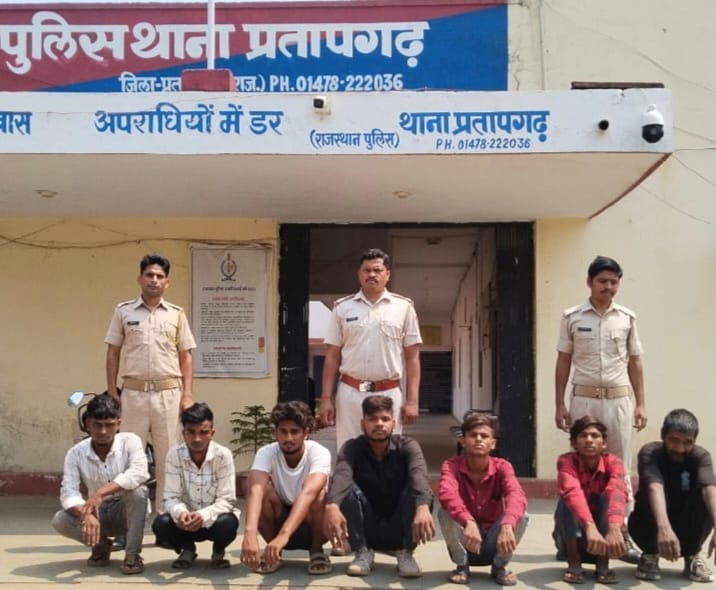 गिरफ्तार अभियुक्तों में विकास मीणा (18) पुत्र नारायण निवासी बसाड़ थाना प्रतापगढ़, अभिषेक गिरी (18) पुत्र अशोक, योगेश (20) पुत्र समरथ निवासी सेमली थाना हथुनिया, संतोष मीणा (20) पुत्र तुलसीराम, पिन्टु मीणा (19) पुत्र शांतिलाल, दीपक मीणा (20) पुत्र शांतिलाल और शेखर मीणा (19) पुत्र घनश्याम निवासी मालीखेड़ा थाना प्रतापगढ़ शामिल हैं।