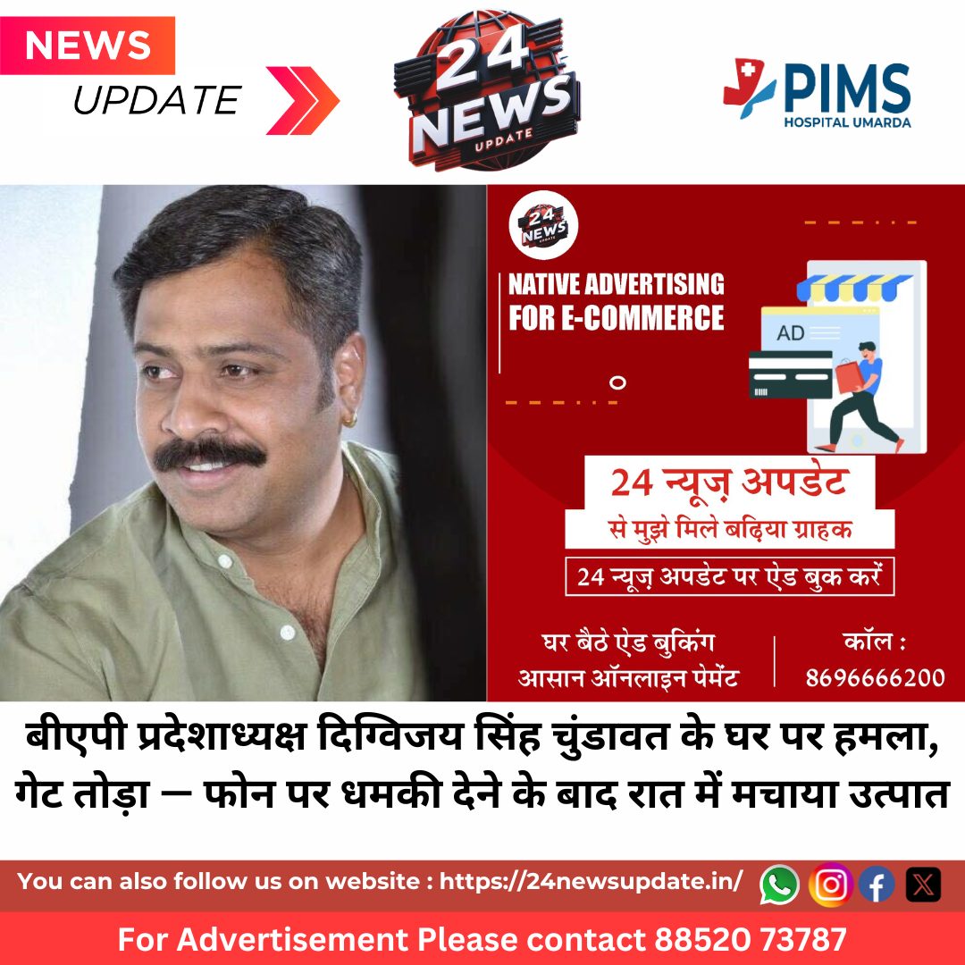 24 News Update डूंगरपुर। बीएपी के सामान्य वर्ग प्रदेशाध्यक्ष दिग्विजय सिंह चुंडावत के डूंगरपुर जिले के करेलिया गांव स्थित आवास पर देर रात कुछ लोगों ने हमला कर दिया। आरोप है कि हमलावरों ने पहले फोन पर जान से मारने की धमकी दी और उसके कुछ घंटे बाद घर का गेट तोड़ दिया।