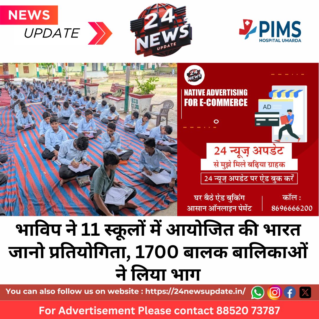 24 News Update सागवाड़ा (जयदीप जोशी)। भारत विकास परिषद द्वारा भारत जानो प्रतियोगिता का आयोजन किया जा रहा है जिसके तहत् शनिवार को 11 विद्यालय में प्रतियोगिता का आयोजन किया गया जिसमें 1700 बालक बालिकाओ ने वरिष्ठ वर्ग में 2450 बालक बालिकाओं ने कूल 4150 प्रतियोगीयो ने भाग लिया।
