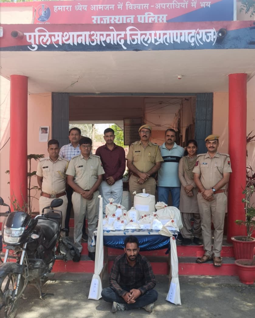 इस सूचना पर एसपी बंसल के निर्देश पर कार्रवाई के लिए अतिरिक्त पुलिस अधीक्षक परबत सिंह और सीओ वृत अरनोद चन्द्रशेखर पालीवाल के मार्गदर्शन एवं एसएचओ हजारी लाल के नेतृत्व में गठित पुलिस टीमों द्वारा मुर्गीफार्म पर दबिश देकर वहां मौजूद तस्कर फरदीन खान पठान को डिटेन कर तलाशी ली गई।