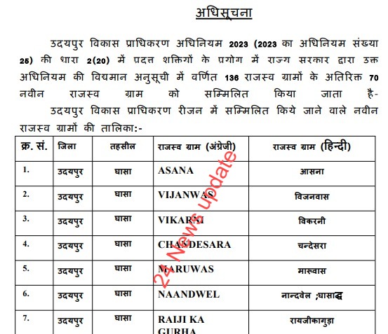 24 News Update जयपुर/उदयपुर। राजस्थान सरकार ने नगरीय विकास एवं स्वायत्त शासन विभाग द्वारा उदयपुर विकास प्राधिकरण अधिनियम, 2023 की धारा 2(20) के तहत उदयपुर विकास प्राधिकरण क्षेत्र में 70 नए राजस्व गांवों को अधिसूचित किया है। अब तक कुल 136 गांव प्राधिकरण क्षेत्र में अधिसूचित थे। इस नई अधिसूचना के साथ यह संख्या बढ़कर 206 हो जाएगी। राज्यपाल की स्वीकृति से जारी इस अधिसूचना को शासन उप सचिव ने हस्ताक्षरित किया है और संबंधित विभागों को सूचित कर कार्रवाई के निर्देश जारी किए गए हैं। इस अधिसूचना के बाद इन गांवों में नियोजित नगरीय विकास, आधारभूत संरचना, भवन निर्माण अनुमति, जनसुविधाओं का विस्तार और भूमि उपयोग योजना जैसे कार्य उदयपुर विकास प्राधिकरण के अंतर्गत आ जाएंगे।