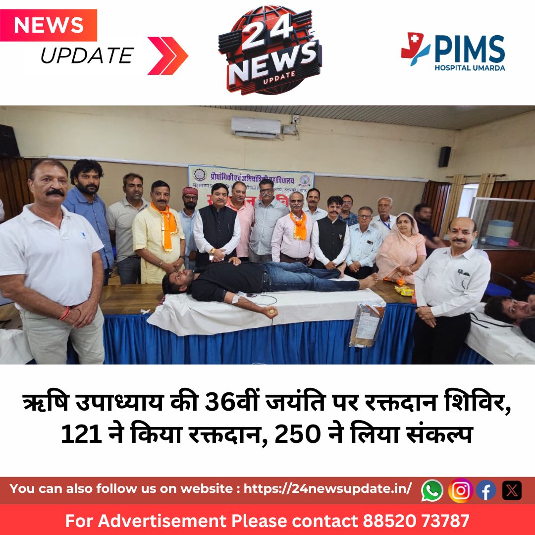 24 News Update उदयपुर। एमपीयूटी छात्र संघ के पूर्व अध्यक्ष स्व. ऋषि उपाध्याय की 36वीं जयंति पर शुक्रवार को सीटीएई महाविद्यालय सभागार में चौथा विशाल रक्तदान शिविर आयोजित हुआ। शिविर का शुभारंभ शहर विधायक ताराचंद जैन, एमपीयूटी के पूर्व कुलपति प्रो. एन.एस. राठौड़, प्रो. उमाशंकर शर्मा, राजस्थान विद्यापीठ कुलपति प्रो. शिवसिंह सारंगदेवोत, प्रीति गजेन्द्र सिंह शक्तावत, प्रो. दरियावर सिंह चुण्डावत, समाजसेवी जगदीश राज श्रीमाली, भाजपा शहर जिलाध्यक्ष गजपाल सिंह राठौड़ व जिलाध्यक्ष फतह सिंह राठौड़ ने स्व. उपाध्याय के चित्र पर पुष्पांजलि अर्पित कर किया।