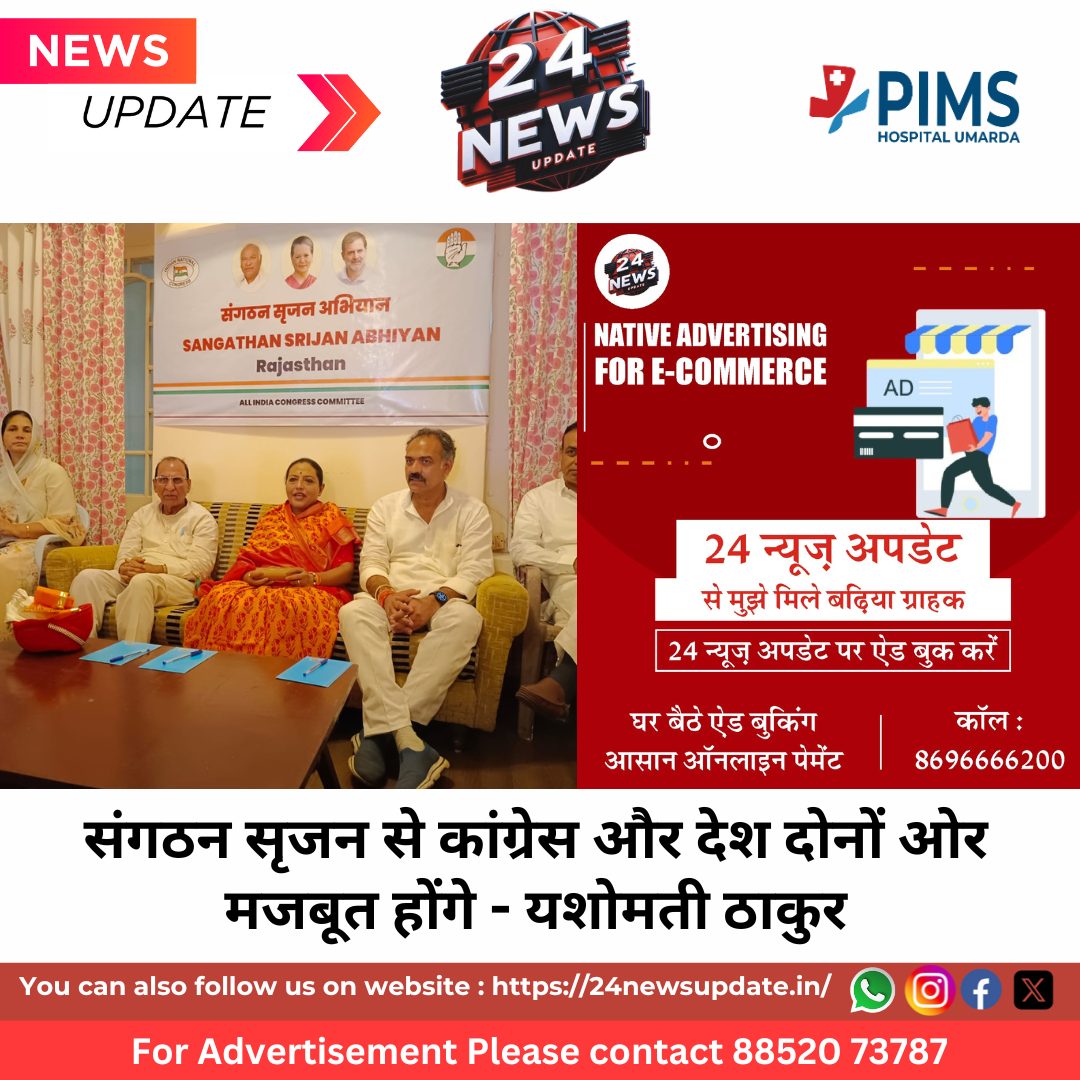 एआईसीसी द्वारा ‘संगठन सृजन अभियान’ हेतु नियुक्त पर्यवेक्षक यशोमती ठाकुर ने प्रेस वार्ता करी। 24 News Update उदयपुर। एआईसीसी द्वारा ‘संगठन सृजन अभियान’ हेतु नियुक्त पर्यवेक्षक यशोमती ठाकुर ने प्रेस वार्ता कर कहा कि कांग्रेस पार्टी में वर्ष 2025 को ‘संगठन सृजन वर्ष’ के रूप में घोषित किया है। इसी क्रम में ‘संगठन सृजन अभियान’ चलाया जा रहा है जो कि अभी तक देश के चार राज्यों गुजरात, मध्यप्रदेश, झारखंड, हरियाणा, में हो चुका है। अब दिसंबर तक राजस्थान में भी ‘संगठन सृजन अभियान’ पूरा हो जाएगा। संगठन सृजन अभियान का मकसद अंतिम व्यक्ति तक पहुंचना है जिससे कि संगठन में काम करने वाले हर व्यक्ति को ताकत मिल सके और संगठन के साथ ही देश भी मजबूत हो सके। ‘संगठन सृजन अभियान’ से संगठन तो मजबूत होगा ही साथ में देश भी मजबूत होगा।श्रीमती ठाकुर ने कहा कि अभियान का मकसद संगठन और देश में सर्वधर्म भावना को बढ़ाना है। संगठन मजबूत हो और सर्वधर्म भावना बढ़े जिससे कि देश भी सुरक्षित रहे आठ ही सही बात ऊपर तक पहुंच सके यही इस अभियान का मकसद है।इस अभियान में हम जिला कांग्रेस कमेटी की बैठक के साथ-साथ ब्लॉक कांग्रेस कमेटी की बैठकर भी लेंगे और सभी से वन टू वन चर्चा भी करेंगे। जिससे कि संगठन और अधिक मजबूत हो सके और इसके लिए हमने 10 अक्टूबर तक सभी ब्लॉक में जाने का कार्यक्रम बना लिया गया है। और हम हर ब्लॉक में जाकर पदाधिकारियों, वरिष्ठ एवं सक्रिय कार्यकर्ताओं से संवाद करेंगे वन टू वन चर्चा करेंगे। प्रेस वार्ता में यशोमती ठाकुर के साथ पीसीसी ऑब्जर्वर चेतन डूडी, अभिषेक चौधरी, गोविंद डांगा, उदयपुर देहात जिला कांग्रेस अध्यक्ष कचरू लाल चौधरी, उदयपुर शहर जिला कांग्रेस अध्यक्ष फतह सिंह राठौड़, ताराचंद मीणा, पूर्व विधायक प्रीति शक्तावत, जगदीश राज श्रीमाली, पीसीसी उपाध्यक्ष हीरा लाल दरांगी, पूर्व मंत्री डॉ मांगी लाल गरासिया, पीसीसी महासचिव पंकज शर्मा, सुरेश सुथार, उदयपुर देहात जिला कांग्रेस प्रवक्ता डॉ संजीव राजपुरोहित, शहर प्रवक्ता पंकज पालीवाल, गजेंद्र कोठारी सहित कई पदाधिकारी उपस्थित रहे। आदरणीय संपादक महोदय जी,सादर प्रकाशनार्थ डॉ संजीव राजपुरोहितप्रवक्ताउदयपुर देहात जिला कांग्रेस कमेटी Share this: Share on X (Opens in new window) X Share on Facebook (Opens in new window) Facebook More Email a link to a friend (Opens in new window) Email Share on WhatsApp (Opens in new window) WhatsApp Like this:Like Loading... Related Discover more from 24 News Update Subscribe to get the latest posts sent to your email. Type your email… Subscribe Post navigation विश्व वास्तुकला दिवस पर उदयपुर को मिली सृजन की सौगात ‘रंगत–रास्ता री…’ कला उत्सव का अनूठा आगाज पंजाब के राज्यपाल श्री कटारिया 13 से उदयपुर प्रवास पर