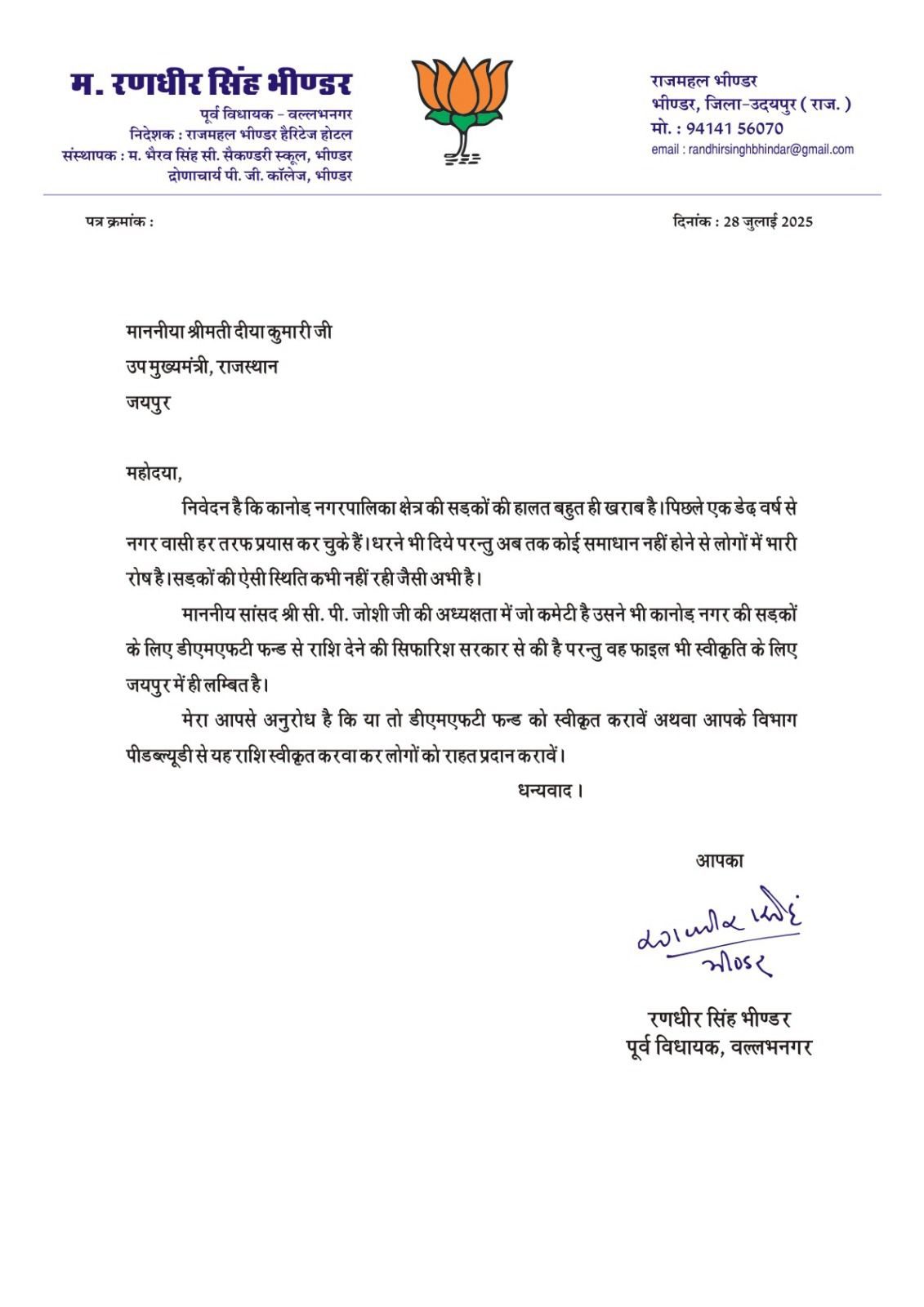24 News Update उदयपुर। वल्लभनगर पूर्व विधायक व भाजपा नेता रणधीर सिंह भीण्डर ने प्रदेश की उपमुख्यमंत्री दीया कुमारी को पत्र लिखकर कानोड़ नगर पालिका में बदहाल हो रही सड़कों को दुरस्त करने के लिए बजट स्वीकृत करने की मांग की। पत्र में बताया कि कानोड़ नगरपालिका क्षेत्र की सड़कों की हालत बहुत ही खराब है। पिछले एक डेढ़ वर्ष से नगर वासी हर तरफ प्रयास कर चुके हैं। धरने भी दिये परन्तु अब तक कोई समाधान नहीं होने से लोगों में भारी रोष है। सड़कों की ऐसी स्थिति कभी नहीं रही जैसी अभी है। सांसद सीपी जोशी की अध्यक्षता में जो कमेटी है उसने भी कानोड़ नगर की सड़कों के लिए डीएमएफटी फन्ड से राशि देने की सिफारिश सरकार से की है परन्तु वह फाइल भी स्वीकृति के लिए जयपुर में ही लम्बित है। इसलिए डीएमएफटी फन्ड को स्वीकृत करावें अथवा पीडब्ल्यूडी विभाग से राशि स्वीकृत करवाकर लोगों को राहत देने का काम करें।