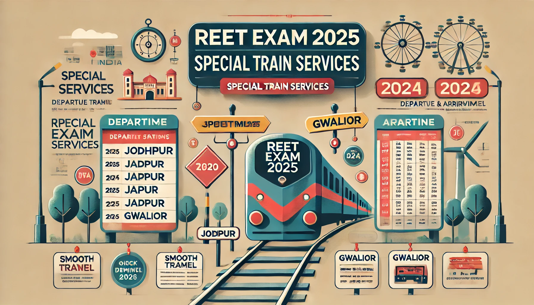 24 न्यूज अपडेट. जयपुर। REET परीक्षा 2025: परीक्षार्थियों के लिए विशेष रेल सेवाएँ 🚆 📢 उत्तर पश्चिम रेलवे द्वारा REET 2025 में भाग लेने वाले परीक्षार्थियों की सुविधा के लिए विशेष रेल सेवाओं का संचालन किया जा रहा है, ताकि वे सुगमता और सुरक्षित रूप से अपनी परीक्षा केंद्रों तक पहुँच सकें। 📝 आधिकारिक घोषणा: मुख्य जनसंपर्क अधिकारी, कैप्टन शशि किरण 📌 विशेष रेल सेवा विवरण 1️⃣ गाड़ी संख्या 04811 / 04812: जोधपुर – ग्वालियर – ढेहर का बालाजी (जयपुर) रीट परीक्षा स्पेशल ट्रेन (1 ट्रिप) गाड़ी संख्यामार्गप्रस्थानआगमन04811जोधपुर → ग्वालियर25.02.25 को 23:00 बजेजयपुर (04:00, प्रस्थान 04:10) → ग्वालियर (12:30)04812ग्वालियर → ढेहर का बालाजी (जयपुर)26.02.25 को 19:30 बजे04:30 बजे आगमन 📍 स्टॉपेज: राई का बाग, पीपाड रोड, गोटन, मेडता रोड, डेगाना, मकराना, कुचामन सिटी, नांवा, फुलेरा, जयपुर, गांधीनगर जयपुर, दौसा, बांदीकुई, मंडावर महवा रोड, खेडली, भरतपुर, अछनेरा, आगरा कैंट, धौलपुर, मुरेना। 📌 ट्रेन में 20 साधारण श्रेणी और 2 गार्ड डिब्बे (कुल 22 डिब्बे) होंगे। 2️⃣ गाड़ी संख्या 04813 / 04814: ढेहर का बालाजी (जयपुर) – ग्वालियर – ढेहर का बालाजी (जयपुर) रीट परीक्षा स्पेशल ट्रेन (1 ट्रिप) गाड़ी संख्यामार्गप्रस्थानआगमन04813ढेहर का बालाजी (जयपुर) → ग्वालियर27.02.25 को 19:00 बजेअगले दिन 04:00 बजे आगमन04814ग्वालियर → ढेहर का बालाजी (जयपुर)28.02.25 को 08:30 बजे17:55 बजे आगमन 📍 स्टॉपेज: जयपुर, गांधीनगर जयपुर, दौसा, बांदीकुई, मंडावर महवा रोड, खेडली, भरतपुर, अछनेरा, आगरा कैंट, धौलपुर, मुरेना। 📌 ट्रेन में 20 साधारण श्रेणी और 2 गार्ड डिब्बे (कुल 22 डिब्बे) होंगे। 📢 मुख्य विशेषताएँ ✅ REET 2025 परीक्षार्थियों के लिए विशेष रेल सेवाएँ।✅ सुगम और परेशानी मुक्त यात्रा सुनिश्चित की जाएगी।✅ महत्वपूर्ण स्टेशनों पर ठहराव की सुविधा।✅ पर्याप्त सीटिंग क्षमता (प्रत्येक ट्रेन में 22 डिब्बे)। 📌 परीक्षार्थियों को सलाह दी जाती है कि वे ट्रेन के समय की जाँच करें और अपनी यात्रा की योजना पहले से बनाएँ। 🚆✅ 📌 Special Train Services Details 1️⃣ Train No. 04811 / 04812: Jodhpur – Gwalior – Dher Ka Balaji (Jaipur) REET Special Train (1 Trip) Train No.RouteDepartureArrival04811Jodhpur → Gwalior25.02.25 at 23:00Jaipur (04:00, dep. 04:10) → Gwalior (12:30)04812Gwalior → Dher Ka Balaji (Jaipur)26.02.25 at 19:30Arrives at 04:30 📍 Halts: Raika Bagh, Pipad Road, Gotan, Merta Road, Degana, Makrana, Kuchaman City, Nawa, Phulera, Jaipur, Gandhinagar Jaipur, Dausa, Bandikui, Mandawar Mahwa Road, Kherli, Bharatpur, Achhnera, Agra Cantt, Dholpur, Morena. 📌 Train Composition: 20 General Coaches + 2 Guard Coaches (Total: 22 Coaches). 2️⃣ Train No. 04813 / 04814: Dher Ka Balaji (Jaipur) – Gwalior – Dher Ka Balaji (Jaipur) REET Special Train (1 Trip) Train No.RouteDepartureArrival04813Dher Ka Balaji (Jaipur) → Gwalior27.02.25 at 19:00Next day at 04:0004814Gwalior → Dher Ka Balaji (Jaipur)28.02.25 at 08:30Arrives at 17:55 📍 Halts: Jaipur, Gandhinagar Jaipur, Dausa, Bandikui, Mandawar Mahwa Road, Kherli, Bharatpur, Achhnera, Agra Cantt, Dholpur, Morena. 📌 Train Composition: 20 General Coaches + 2 Guard Coaches (Total: 22 Coaches). 📢 Key Highlights ✅ Special Trains arranged for REET 2025 candidates.✅ Ensuring smooth and hassle-free travel.✅ Multiple halts covering major locations.✅ Sufficient seating capacity with 22 coaches per train. 📌 Candidates are advised to check train timings and plan their travel accordingly. Share this: Share on X (Opens in new window) X Share on Facebook (Opens in new window) Facebook More Email a link to a friend (Opens in new window) Email Share on WhatsApp (Opens in new window) WhatsApp Like this:Like Loading... Related Discover more from 24 News