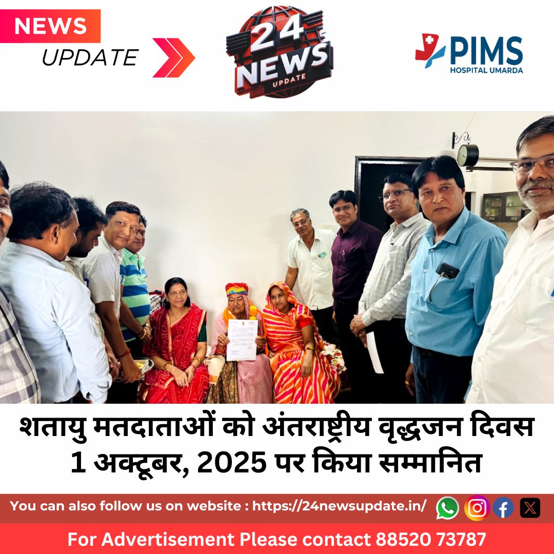 24 News Update. जयपुर। निर्वाचन विभाग, राजस्थान, जयपुर के निर्देशानुसार अंतरराष्ट्रीय वृद्धजन दिवस के अवसर पर शतायु (100 वर्ष व उससे अधिक आयु) मतदाताओं को विशेष सम्मान प्रदान किया गया। उपखण्ड अधिकारी विकास पंचोली के नेतृत्व में यह कार्यक्रम मतदाताओं के निवास स्थान पर जाकर आयोजित किया गया। इस अवसर पर श्रीमती केसर देवी वीरवाल (100 वर्ष, भाग संख्या 81, निम्बाहेड़ा) को फूलों की माला पहनाकर, सॉल ओढ़ाकर एवं मिठाई खिलाकर सम्मानित किया गया। मुख्य निर्वाचन अधिकारी, राजस्थान के नामित प्रशस्ति पत्र को मतदाता के नाम पढ़कर सुनाया गया और उनके सुखी एवं दीर्घ जीवन की कामना की गई।