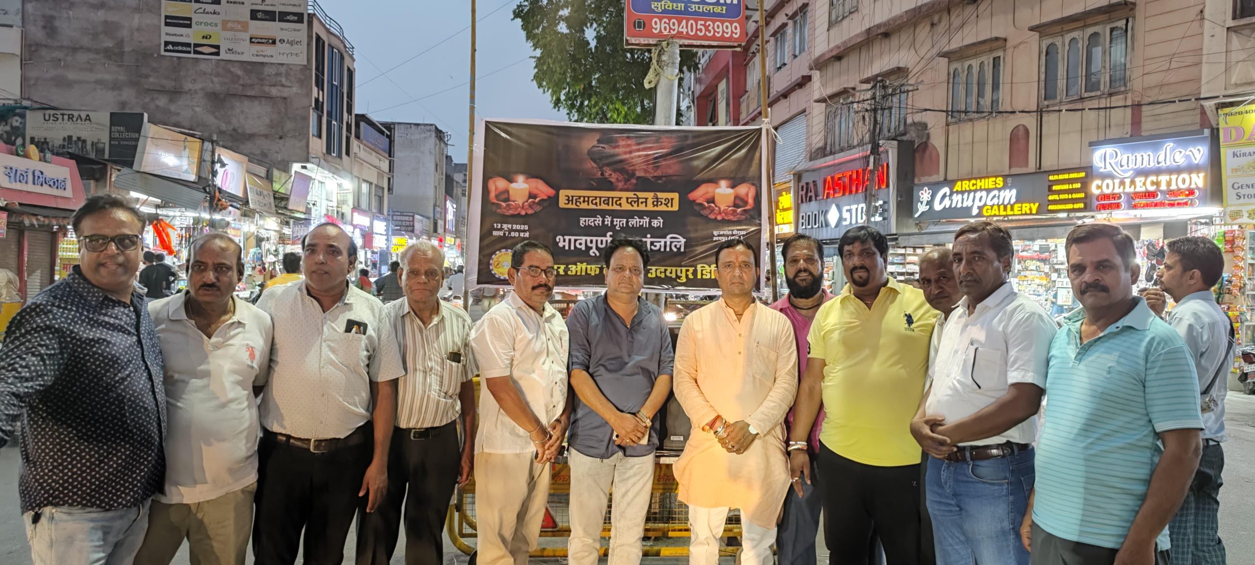 अहमदाबाद में हुए एयर इंडिया के बोइंग विमान हादसे में जान गंवाने वाले यात्रियों को श्रद्धांजलि देने के लिए शुक्रवार सांयकाल चैंबर ऑफ कॉमर्स उदयपुर डिवीजन की ओर से सूरजपोल क्षेत्र में कैंडल सभा का आयोजन किया गया।