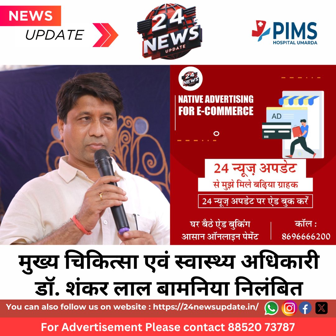 24 News Udpate उदयपुर। राज्य सरकार ने उदयपुर के मुख्य चिकित्सा एवं स्वास्थ्य अधिकारी डॉ. शंकर लाल बामनिया को तत्काल प्रभाव से निलंबित करने के आदेश जारी किए हैं। यह कार्रवाई उनके विरुद्ध विभागीय जांच कार्यवाही प्रस्तावित होने के कारण की गई है।