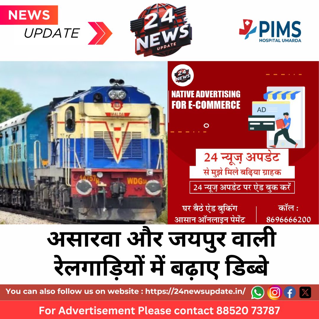 24 न्यूज अपडेट उदयपुर। रेलवे द्वारा अतिरिक्त यात्री यातायात को देखते हुए यात्रियों की सुविधा हेतु 03 जोडी रेलसेवाओं में डिब्बो की अस्थाई बढोतरी की जा रही है।
