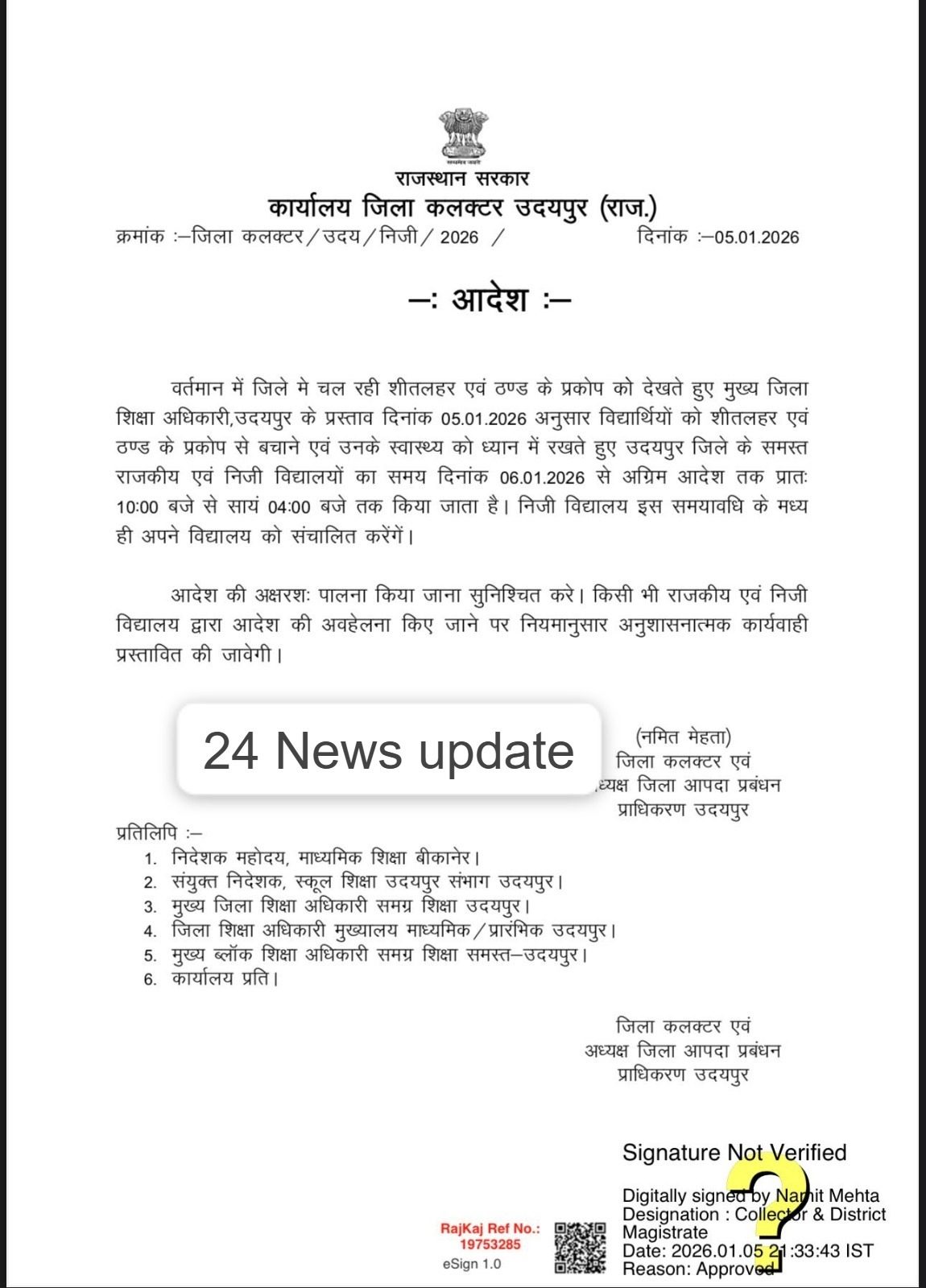 उदयपुर। जिले में लगातार बढ़ रही शीतलहर और कड़ाके की ठंड को देखते हुए जिला प्रशासन ने विद्यार्थियों के स्वास्थ्य के मद्देनज़र अहम निर्णय लिया है। जिला कलक्टर नमित मेहता ने आदेश जारी कर उदयपुर जिले के सभी राजकीय एवं निजी विद्यालयों के संचालन समय में परिवर्तन किया है। जारी आदेश के अनुसार 6 जनवरी 2026 से अग्रिम आदेश तक जिले के समस्त सरकारी व निजी स्कूल प्रातः 10 बजे से सायं 4 बजे तक ही संचालित किए जाएंगे। निजी विद्यालयों को भी इसी निर्धारित समयावधि के भीतर अपने विद्यालय संचालन के निर्देश दिए गए हैं। यह निर्णय मुख्य जिला शिक्षा अधिकारी उदयपुर के प्रस्ताव के आधार पर लिया गया है, ताकि विद्यार्थियों को शीतलहर और ठंड के प्रकोप से बचाया जा सके तथा उनके स्वास्थ्य पर प्रतिकूल प्रभाव न पड़े। जिला प्रशासन ने स्पष्ट किया है कि आदेश की अक्षरशः पालना सुनिश्चित की जाए। जिला कलक्टर ने चेतावनी दी है कि यदि किसी भी राजकीय या निजी विद्यालय द्वारा आदेश की अवहेलना की जाती है, तो संबंधित संस्था के खिलाफ नियमानुसार अनुशासनात्मक कार्रवाई की जाएगी। आदेश की प्रतिलिपि शिक्षा विभाग के समस्त संबंधित अधिकारियों को आवश्यक कार्रवाई के लिए भेज दी गई है। Share this: Share on X (Opens in new window) X Share on Facebook (Opens in new window) Facebook More Email a link to a friend (Opens in new window) Email Share on WhatsApp (Opens in new window) WhatsApp Like this:Like Loading... Related Discover more from 24 News Update Subscribe to get the latest posts sent to your email. Type your email… Subscribe Post navigation शीतलहर का असर: भीलवाड़ा, प्रतापगढ़, चित्तौड़गढ़ सहित 17 जिलों में स्कूलों में अवकाश, आंगनबाड़ी केंद्र भी बंद पोरवाल समाज ने किया मुमुक्षु दीक्षार्थी रविशा जैन इति का बहुमान वरघोड़ा एवं बहुमान समारोह में उमड़े समाजजन गुरूकुलवास में सीखी प्रभु भक्तिः मुमुक्षु रविशा