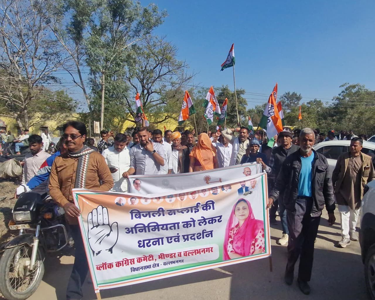 24 News Update भींडर। क्षेत्र में किसानों को खाद व बिजली की गंभीर समस्याओं को लेकर ब्लॉक कांग्रेस कमेटी भींडर–वल्लभनगर के नेतृत्व में सैकड़ों कांग्रेस कार्यकर्ताओं ने जोरदार प्रदर्शन किया। कांग्रेस की पूर्व विधायक प्रीति गजेंद्र सिंह शक्तावत के नेतृत्व में कार्यकर्ता ढोल-नगाड़ों के साथ उपखंड कार्यालय पहुँचे, जहाँ धरना देकर भजनलाल सरकार के खिलाफ नारेबाजी की गई।