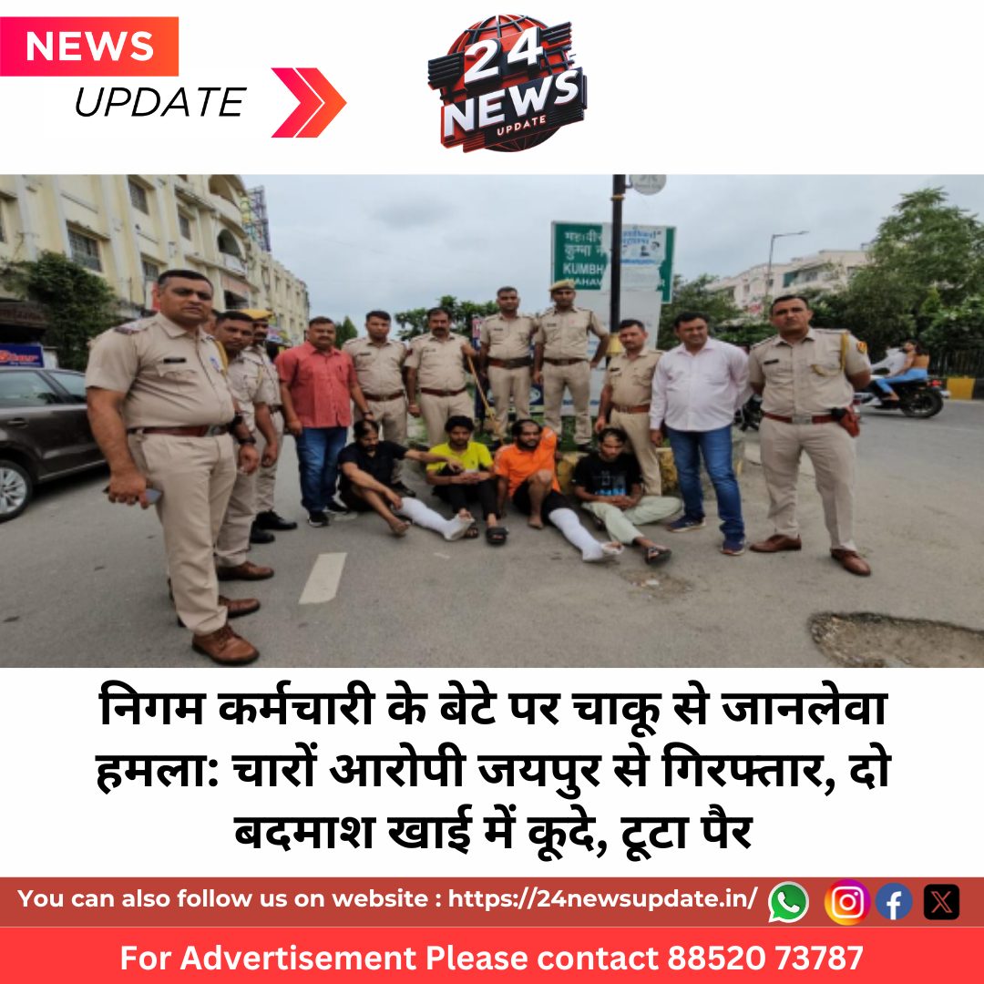 24 News Update उदयपुर। हिरणमगरी थाना क्षेत्र में नगर निगम कर्मचारी के बेटे हरिश नकवाल पर चाकू से हुए जानलेवा हमले के मामले में जिला पुलिस अधीक्षक योगेश गोयल के निर्देशन में हिरणमगरी थाना पुलिस ने त्वरित कार्रवाई करते हुए चारों आरोपियों को जयपुर से गिरफ्तार कर लिया है। मुख्य आरोपी अम्बामाता थाने का हिस्ट्रीशीटर ऋतिक जीनगर और भूपालपुरा थाने का हिस्ट्रीशीटर प्रवीण सालवी पुलिस को देख भागते हुए खाई में कूद गए, जिससे उनके पैर चोटिल हो गए। 3 जुलाई रात करीब 8 बजे नगर निगम कर्मचारी लेखराज नकवाल के बेटे हरिश नकवाल पर उस समय हमला हुआ, जब वह हिरणमगरी सेक्टर-3 पेट्रोल पंप से पेट्रोल भरवाकर लौट रहा था। उसे एक काली स्कॉर्पियो और एक स्विफ्ट कार ने टक्कर मारी। इन गाड़ियों से ऋतिक चौहान, प्रवीण सालवी, विक्की (आयुष्मान सिंह) और ऋषभ गुर्जर सहित 8–10 बदमाश निकले और उस पर चाकुओं से ताबड़तोड़ हमला कर दिया। गंभीर हालत में उसे कनक हॉस्पिटल में भर्ती कराया गया, जहां उसने पिता को पूरी घटना बताई। पीड़ित के पिता लेखराज नकवाल ने हिरणमगरी थाने में रिपोर्ट दर्ज कराई। इस पर प्रकरण संख्या 245/2025 धारा 189(2), 109(1) BNS 2023 के तहत मामला दर्ज कर अनुसंधान उपनिरीक्षक नवल सिंह को सौंपा गया। प्रकरण की गंभीरता को देखते हुए थानाधिकारी भरत योगी, सउनि नवल सिंह, हैड कांस्टेबल राजेन्द्र सिंह, कांस्टेबल रामजी लाल, नंदकिशोर, कल्पेश कुमार, DST के शक्ति सिंह, मुकेश कुमार और साइबर सेल के लोकेश रायकवाल ने मिलकर बदमाशों का पीछा करते हुए जयपुर में डिटेन किया।