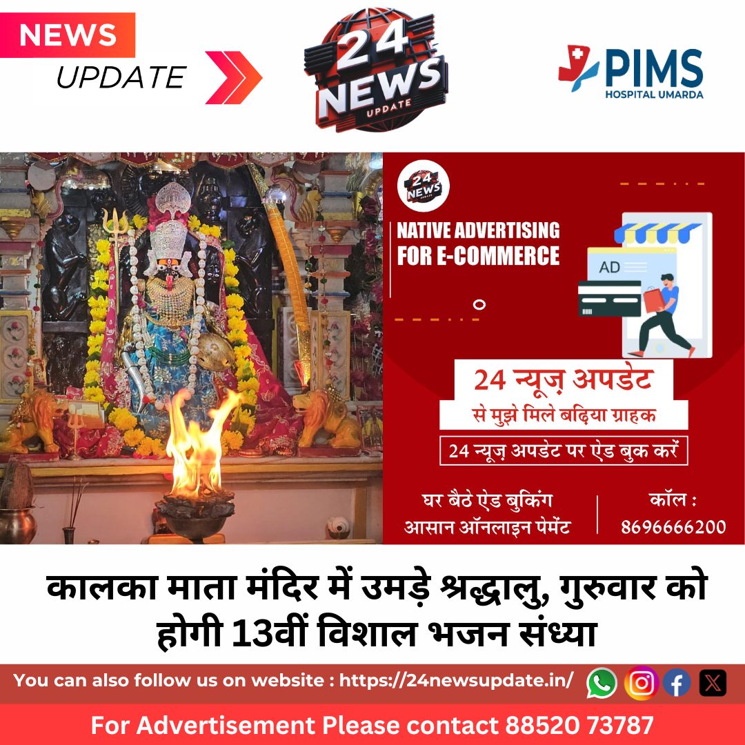 मंदिर पुजारी देवेन्द्र सिंह गौड़ ने बताया कि गुरुवार रात 8 बजे से कालका माता मित्र मंडल की ओर से 13वीं विशाल भजन संध्या का आयोजन किया जाएगा। इस अवसर पर ख्यातनाम भजन गायक शंभू धनगर और हर्ष सुथार भजनों की प्रस्तुतियां देंगे तथा झांकियां भी सजाई जाएंगी। भजन संध्या का संचालन रमेश वैष्णव करेंगे, जबकि कार्यक्रम का लाइव प्रसारण आर.के. मिक्सर के रामजी द्वारा किया जाएगा।
