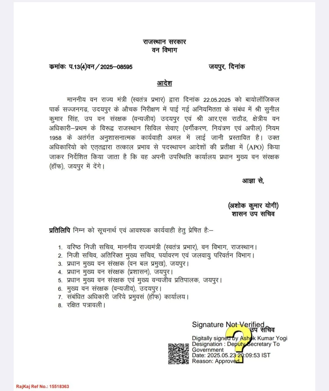 वन मंत्री की नाराजगी के बाद उप वन संरक्षक और रेंजर को अपनी उपस्थिति प्रधान मुख्य वन संरक्षक कार्यालय, जयपुर में देने के निर्देश दिए गए हैं। साथ ही उन्हें फिलहाल एपीओ रखा गया है, यानी नई नियुक्ति के आदेश तक वे कार्यभार ग्रहण नहीं कर सकेंगे।