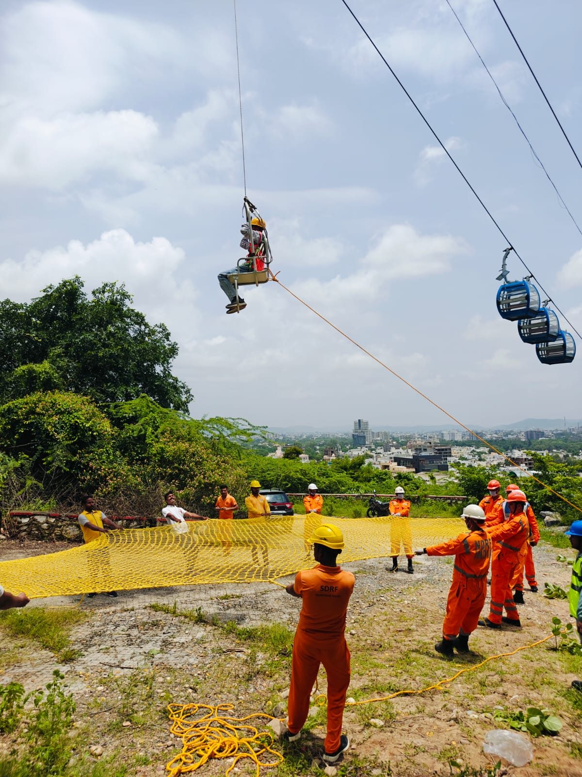 24 News Update उदयपुर। नीमच माता स्थित रोप-वे की ट्रॉलियां तकनीकी कारण से अचानक रुक गई जिससे पर्यटकों की जान सांसत में आ गई। तभी प्रशासन के नेतृत्व में एनडीआरएफ, एसडीआरएफ, फायर सेफ्टी, रोपवे प्रबंधन की ओर से नियुक्त स्टाफ ने मोर्चा संभाला और ट्रॉलियों में फंसे यात्रियों को सुरक्षित निकाला। यह दृश्य था मंगलवार को रोप वे पर किए गए मॉक ड्रिल का।
