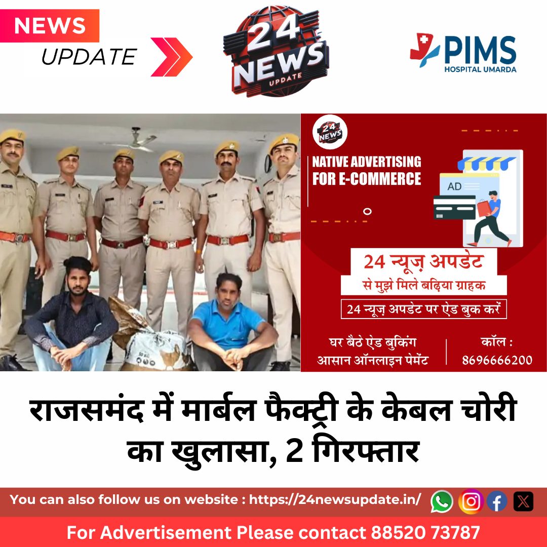 24 News Update राजसमंद। आमेट पुलिस ने राज श्री मार्बल फैक्ट्री, कोटड़ी जोगीमगरा से हुई केबल चोरी का खुलासा करते हुए दो आरोपियों को गिरफ्तार किया। आरोपियों में चोरी करने वाला आरोपी चेनीराम और चोरी का माल खरीदने वाला भैरूलाल शामिल हैं।