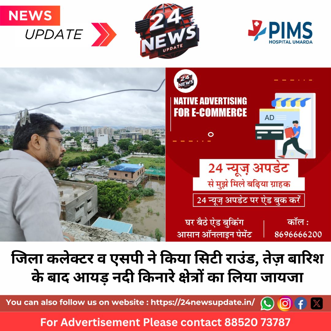 24 news update उदयपुर। शनिवार को हुई तेज बारिश के बाद शहर के आयड़ नदी से सटे कई निचले क्षेत्रों में जलभराव की स्थिति उत्पन्न हो गई। सूचना मिलने पर जिला कलेक्टर नमित मेहता और पुलिस अधीक्षक योगेश गोयल मौके पर पहुंचे और प्रभावित क्षेत्रों का निरीक्षण किया।