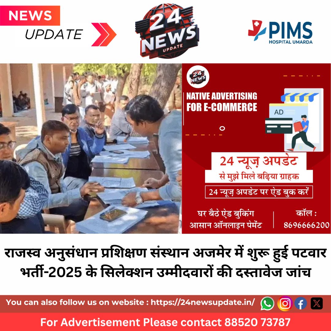 24 News Update अजमेर। राजस्व मंडल अजमेर की ओर से पटवार प्रतियोगी परीक्षा-2025 में अस्थाई रूप से चयनित उम्मीदवारों की पात्रता जांच और दस्तावेज़ सत्यापन का काम आज से आरआरटीई, अजमेर में शुरू हो गया है। सुबह से ही संस्थान के बाहर लंबी कतारें लगी रहीं, उम्मीदवार अपनी बारी का इंतजार कर रहे थे।