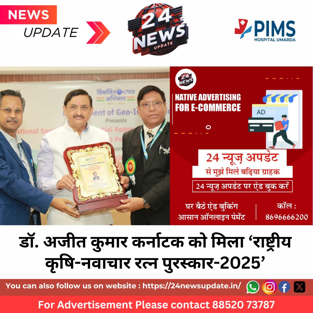 24 News Update उदयपुर, 7 अक्टूबर। महाराणा प्रताप कृषि एवं प्रौद्योगिकी विश्वविद्यालय, उदयपुर के कुलपति डॉ. अजीत कुमार कर्नाटक को ‘राष्ट्रीय कृषि-नवाचार रत्न पुरस्कार-2025’ से सम्मानित किया गया है। यह सम्मान उन्हें भारतीय सामाजिक विज्ञान अनुसंधान परिषद (ICSSR), नई दिल्ली द्वारा प्रायोजित राष्ट्रीय संगोष्ठी “राष्ट्रीय सुरक्षा के लिए भू-स्थानिक दृष्टिकोण: एक सामाजिक परिप्रेक्ष्य” में प्रदान किया गया।