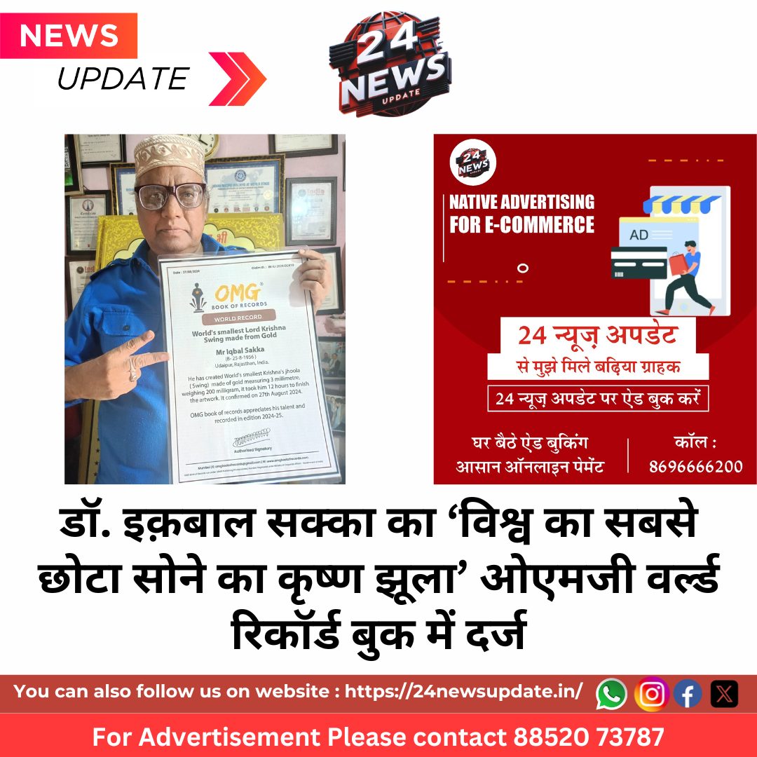 24 News Update उदयपुर। भगवान श्रीकृष्ण जन्माष्टमी के पावन अवसर पर उदयपुर के सुप्रसिद्ध शिल्पकार और 100 से अधिक विश्व रिकॉर्ड धारक डॉ. इक़बाल सक्का ने एक और अनोखा कीर्तिमान रच दिया है। उन्होंने विश्व का सबसे छोटा सोने का कृष्ण झूला बनाकर ओएमजी वर्ल्ड रिकॉर्ड बुक में अपना नाम दर्ज कराया है। यह अद्वितीय झूला मात्र 3×3 मिलीमीटर आकार का है और इसका वजन केवल 200 मिलीग्राम है। खास बात यह है कि इसे आम झूलों की तरह डोरी से झुलाया भी जा सकता है। डॉ. सक्का ने इस झूले को तैयार करने में कुल 12 घंटे का समय लगाया। डॉ. सक्का ने बताया कि उनकी सभी कलाकृतियां विश्व एकता और सद्भाव का संदेश देती हैं। इस झूले को बनाने में बारीक हस्तकला तकनीक का प्रयोग किया गया, जो उनके वर्षों के अनुभव और धैर्य का परिणाम है। इस कलाकृति को ओएमजी वर्ल्ड रिकॉर्ड बुक के संपादक प्रो. डॉ. दिनेश गुप्ता ने महाराष्ट्र, मुंबई से प्रमाणित करते हुए “विश्व का सबसे छोटा सोने का श्रीकृष्ण झूला” घोषित किया और आधिकारिक प्रमाणपत्र प्रदान किया।