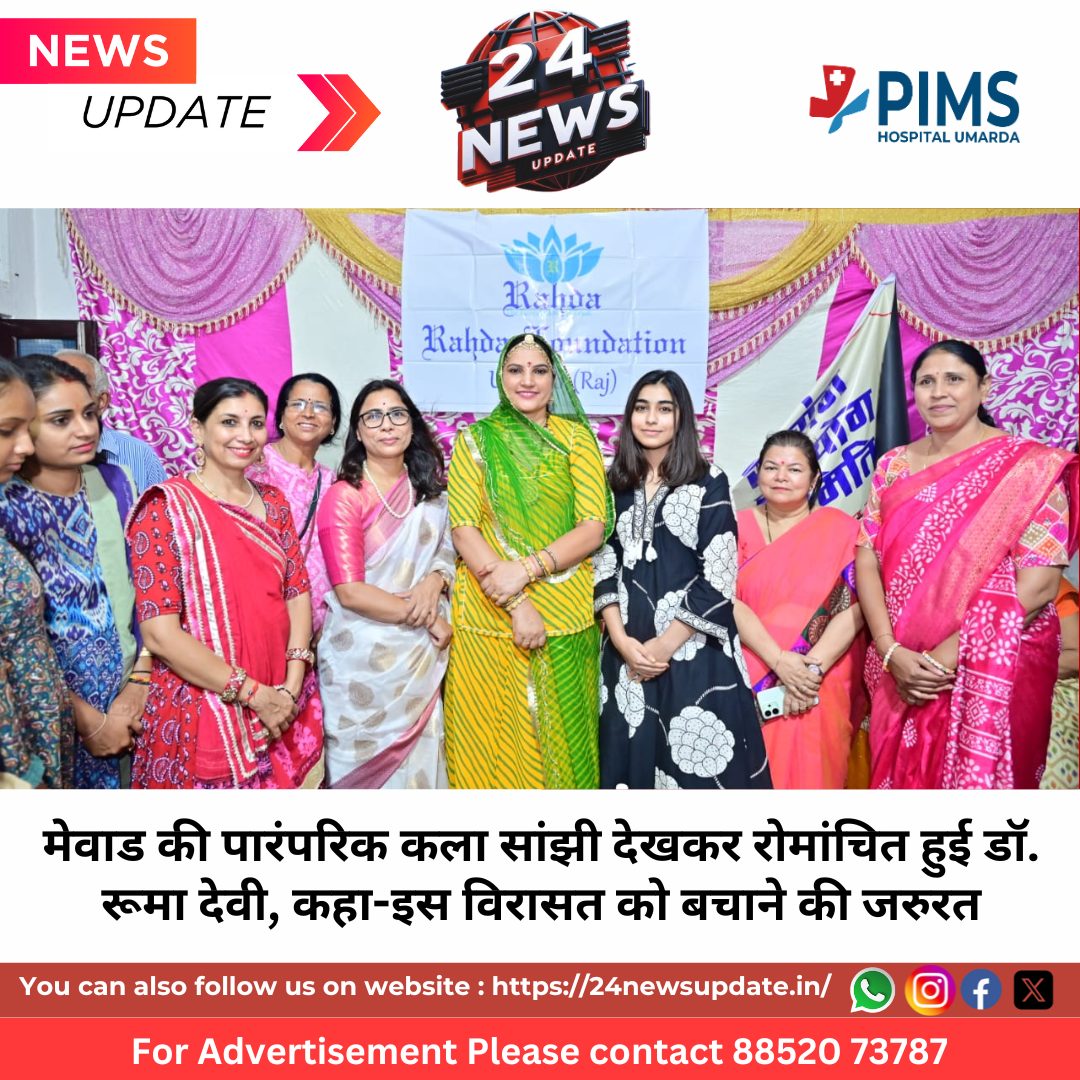 24 News Update उदयपुर। राजीविका की ब्रांड एम्बेसडर व अंतरराष्ट्रीय ख्याति प्राप्त समाजसेवी डॉ. रूमा देवी मेवाड की पारंपरिक कला सांझी को देखकर रोमांचित हो उठी। रूमा देवी ने कहा कि इस तरह की परंपराओं को जीवित रखने की आवश्यकता है जिससे हमारी संस्कृति और विरासत का भी संरक्षण हो।