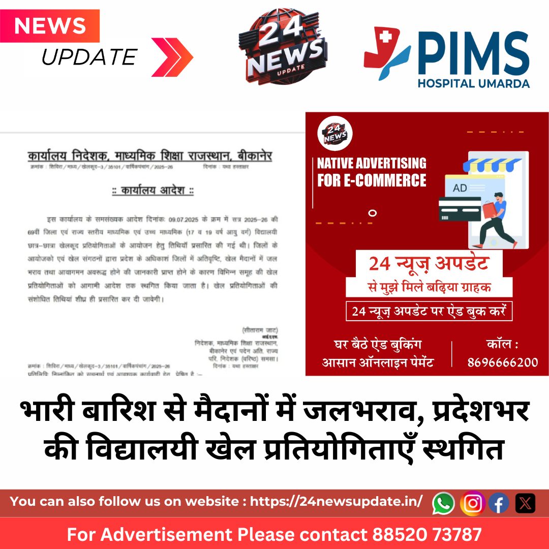 24 News Update उदयपुर। प्रदेश में लगातार हो रही भारी वर्षा के चलते अधिकांश जिलों में खेल मैदानों में जलभराव और आवागमन अवरुद्ध होने की स्थिति बनी हुई है। इसी कारण शिक्षा विभाग ने सत्र 2025-26 की जिला एवं राज्य स्तरीय माध्यमिक एवं 17-18 वर्ष आयु वर्ग विद्यालयी छात्र-छात्रा खेलकूद प्रतियोगिताओं को आगामी आदेश तक स्थगित कर दिया है।