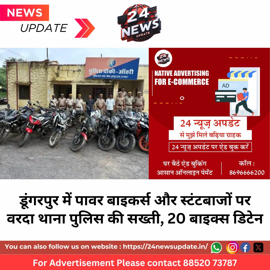 24 News Update डूंगरपुर, । जिले के वरदा थाना क्षेत्र में पावर बाइक और स्टंटबाजों के खिलाफ सख्त कार्रवाई करते हुए पुलिस ने अभियान चलाकर 20 पावर बाइकों को डिटेन किया है। यह कार्रवाई सड़क सुरक्षा और आमजन की सुरक्षा को ध्यान में रखते हुए की गई है। वरदा थानाधिकारी रतनलाल ने जानकारी देते हुए बताया कि क्षेत्र में तेज रफ्तार से बाइक दौड़ाने और स्टंटबाजी की बढ़ती घटनाओं को लेकर विशेष अभियान चलाया जा रहा है। इसी क्रम में आंतरी चौकी प्रभारी संतोष कुमार के नेतृत्व में पुलिस टीम ने विभिन्न स्थानों पर नाकाबंदी की।