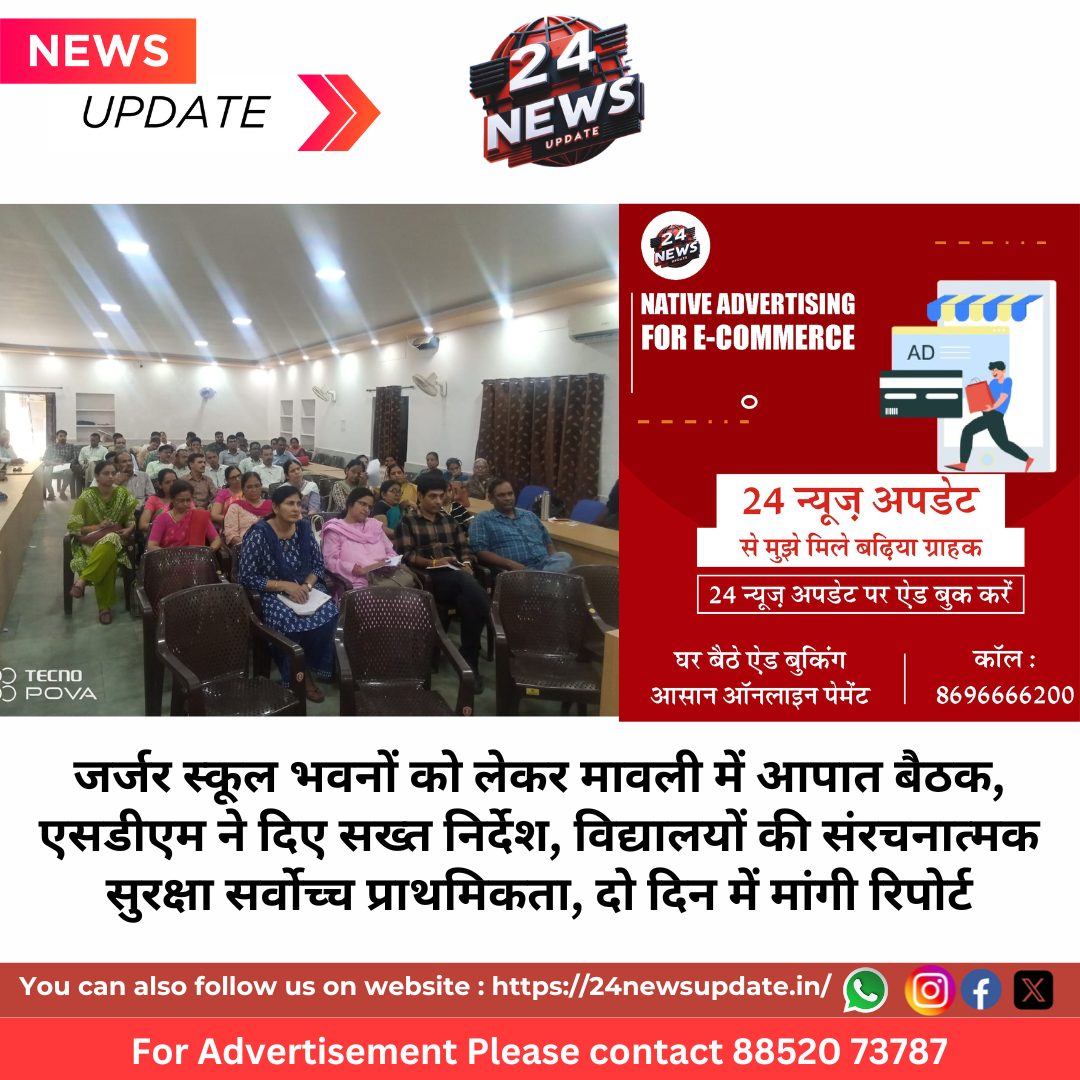 24 News Update मावली। राज्य सरकार के निर्देशों के तहत विद्यालय भवनों की भौतिक स्थिति के सत्यापन और छात्रों की सुरक्षा सुनिश्चित करने के उद्देश्य से मावली व खेमली ब्लॉक के समस्त पंचायत प्रारंभिक शिक्षा अधिकारियों (PEEO/UCEEO) की एक आपात बैठक सोमवार को आयोजित की गई। बैठक की अध्यक्षता उपखंड अधिकारी रमेश सिरवी पुनाड़िया ने की। बैठक में मुख्य ब्लॉक शिक्षा अधिकारी प्रमोद कुमार सुथार, समग्र शिक्षा के कनिष्ठ अभियंता दीपक त्रिवेदी, एवं अन्य प्रशासनिक अधिकारी मौजूद रहे।