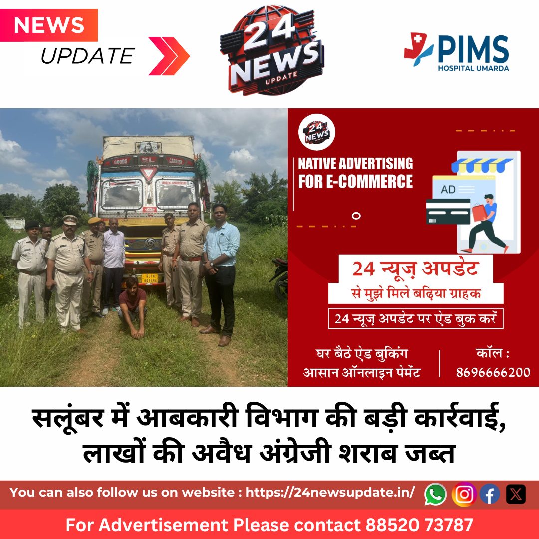24 News Update सलूंबर। उदयपुर जिले की खेरवाड़ा आबकारी टीम ने सलूंबर जिले के परसाद थाना क्षेत्र में अवैध शराब की बड़ी खेप पकड़ने में सफलता हासिल की है। आबकारी निरीक्षक जितेंद्र सिंह राठौड़ ने बताया कि मुखबिर से सूचना मिली थी कि उदयपुर-अहमदाबाद राष्ट्रीय राजमार्ग पर भारी मात्रा में शराब की तस्करी हो रही है। सूचना पर कार्रवाई करते हुए टीम ने खरबर के पास हाईवे पर नाकाबंदी की। इस दौरान संदिग्ध रूप से आते एक 12 चक्का अशोक लीलैंड बंद कंटेनर को रोककर तलाशी ली गई। तलाशी में कंटेनर से हरियाणा निर्मित विभिन्न ब्रांड की 225 कार्टून अंग्रेजी शराब बरामद हुई, जिसे अवैध रूप से गुजरात ले जाया जा रहा था। आबकारी टीम ने मौके पर ही कंटेनर जब्त कर चालक को गिरफ्तार कर लिया। अधिकारियों के अनुसार बरामद शराब की कीमत लाखों रुपये आंकी गई है। मामले में आगे की कानूनी कार्रवाई जारी है। Share this: Share on X (Opens in new window) X Share on Facebook (Opens in new window) Facebook More Email a link to a friend (Opens in new window) Email Share on WhatsApp (Opens in new window) WhatsApp Like this:Like Loading... Related Discover more from 24 News Update Subscribe to get the latest posts sent to your email. Type your email… Subscribe Post navigation कल होगा रावण कुम्भकर्ण, मेघनाद व पुतलों का भव्य दहन किसी के साथ की भलाई व्यर्थ नहीं जाती वह कब किस रूप में लौटकर आएगी ईश्वर जानता है – संत तिलकराम