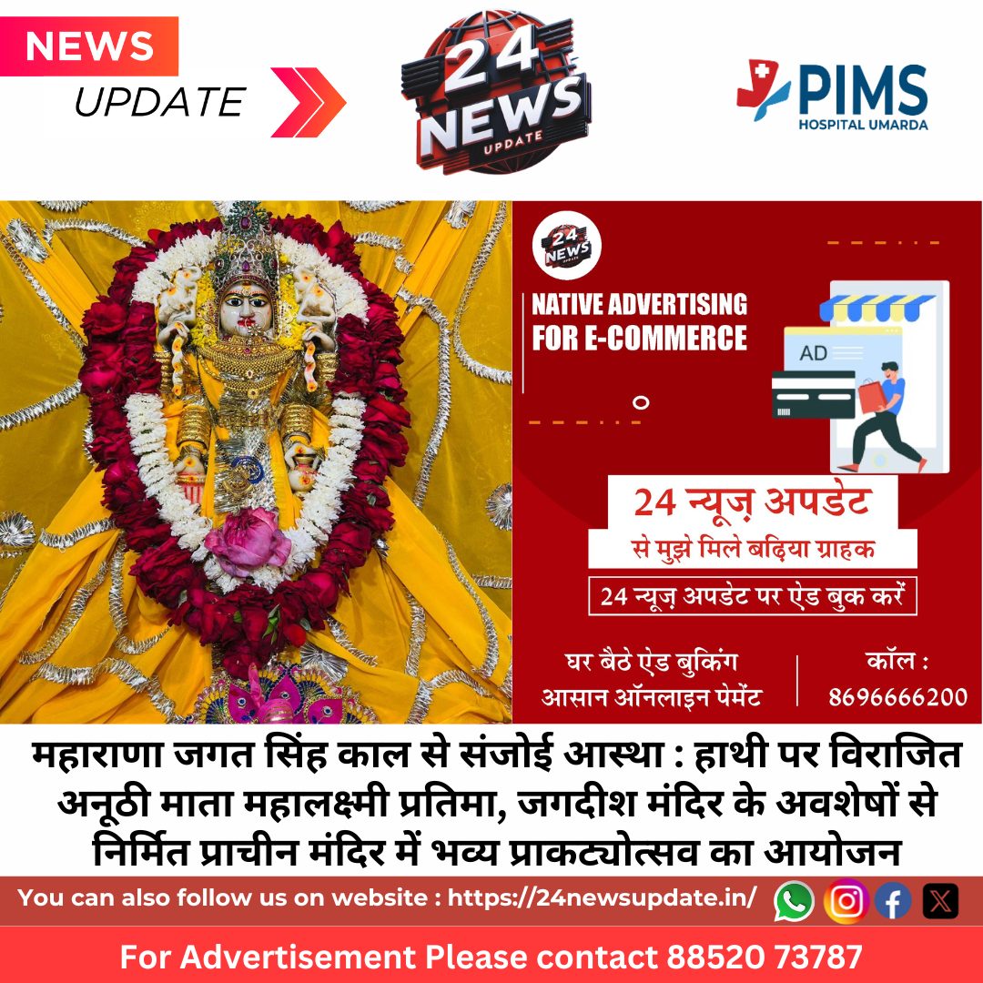 24 News Update उदयपुर। सैकड़ों वर्षों से मेवाड़वासियों के हृदय में माता महालक्ष्मी के प्रति अटूट आस्था संजोई गई है। महाराणा जगत सिंह के शासनकाल में स्थापित यह प्राचीन मंदिर उदयपुर के भट्टियानी चौहट्टा क्षेत्र में स्थित है। विशेष रूप से प्रसिद्ध यह मंदिर इसलिए भी है क्योंकि यहां माता महालक्ष्मी की अनूठी प्रतिमा हाथी पर विराजित है, जो भक्ति, शक्ति और समृद्धि का प्रतीक मानी जाती है। साथ ही, मंदिर का निर्माण जगदीश मंदिर के निर्माण के दौरान बचे पत्थरों से हुआ था, जो इसे ऐतिहासिक दृष्टि से भी महत्वपूर्ण बनाता है।