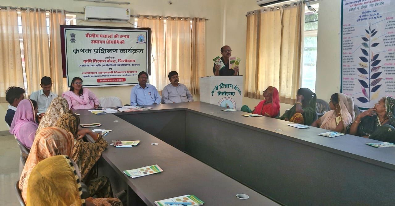24 News Update उदयपुर। सुपारी एवं मसाला विकास निदेशालय, कालीकट (केरल) के सहयोग से कृषि विज्ञान केन्द्र, चित्तौड़गढ़ में बीजीय मसालों की उन्नत उत्पादन तकनीक विषय पर एक दिवसीय कृषक प्रशिक्षण कार्यक्रम आयोजित किया गया। प्रशिक्षण का उद्देश्य किसानों को बीजीय मसालों की आधुनिक खेती, पोषक तत्व प्रबंधन और मूल्य संवर्धन की तकनीकों से अवगत कराना था। केन्द्र के वरिष्ठ वैज्ञानिक एवं अध्यक्ष डॉ. रतन लाल सोलंकी ने किसानों को बीजीय मसालों की खेती की उपयोगिता बताते हुए कहा कि इन फसलों को अपनाकर किसान अपनी आय में उल्लेखनीय वृद्धि कर सकते हैं। उन्होंने समन्वित पोषक तत्व प्रबंधन के महत्व, आवश्यक पोषक तत्वों की भूमिका, पौधों में पोषक तत्वों की कमी के लक्षण और उनके समाधान पर विस्तार से जानकारी दी।प्रशिक्षण के दौरान डॉ. अभय दशोरा, सहायक आचार्य एवं परियोजना प्रभारी, राजस्थान कृषि महाविद्यालय उदयपुर ने परियोजना के उद्देश्यों पर प्रकाश डालते हुए बीजीय मसालों की उन्नत किस्मों के बारे में विस्तृत जानकारी दी। वहीं सह-परियोजना प्रभारी डॉ. बी.जी. छीपा ने मसालों के प्रसंस्करण और मूल्य संवर्धन की संभावनाओं पर चर्चा की।सह-परियोजना प्रभारी डॉ. उर्मिला ने मृदा स्वास्थ्य की जांच के लिए मिट्टी के नमूने लेने की वैज्ञानिक विधि समझाई तथा मृदा उर्वरता बनाए रखने के लिए जैविक खादों के उपयोग पर जोर दिया। तकनीकी सहायक संजय कुमार धाकड़ ने मेथी की उन्नत खेती के विभिन्न पहलुओं पर किसानों को व्यावहारिक जानकारी दी। प्रशिक्षण कार्यक्रम में कुल 40 प्रगतिशील किसानों ने भाग लिया। इस अवसर पर प्रतिभागी किसानों को विश्वविद्यालय द्वारा प्रकाशित कृषि कैलेंडर भी वितरित किए गए। कार्यक्रम के अंत में डॉ. उर्मिला ने सभी प्रतिभागियों और अतिथियों का धन्यवाद ज्ञापित किया। Share this: Share on X (Opens in new window) X Share on Facebook (Opens in new window) Facebook More Email a link to a friend (Opens in new window) Email Share on WhatsApp (Opens in new window) WhatsApp Like this:Like Loading... Related Discover more from 24 News Update Subscribe to get the latest posts sent to your email. Type your email… Subscribe Post navigation स्वास्थ्य, उद्योग और कृषि में बायोटेक्नोलॉजी की संभावनाओं पर अंतरराष्ट्रीय संगोष्ठी का समापन, 45 शोधार्थियों ने प्रस्तुत किए शोधपत्र मां की कोख में पल रही नन्ही जान, रखें पूरा ध्यान: चौबीसा