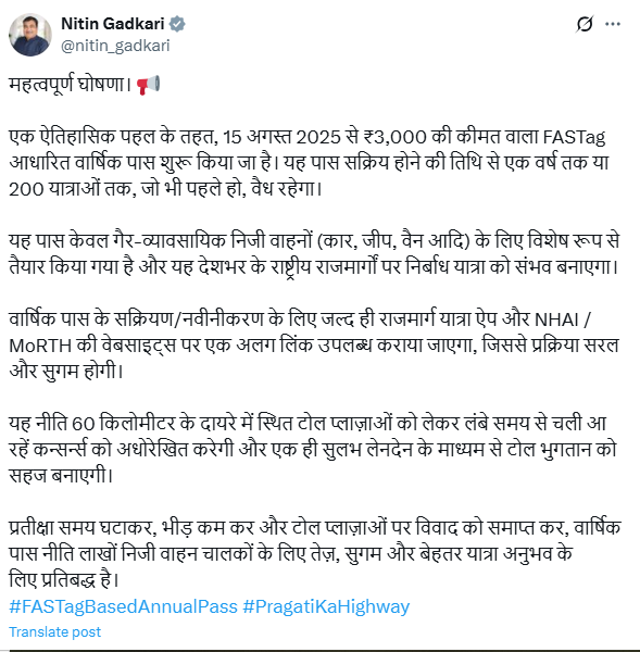 केंद्रीय सड़क परिवहन मंत्री नितिन गडकरी ने सभी अटकलों को खत्म करते हुए आज सोशल नेटवर्किंग साइट ‘X’ के जरिए फास्टैग एनुअल पास को जारी करने का ऐलान किया