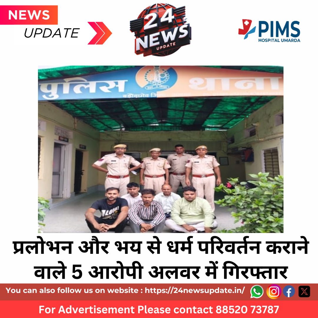 24 News Update जयपुर। अलवर ज़िला पुलिस ने एक बड़ी कार्रवाई करते हुए गरीब हिंदू महिलाओं और पुरुषों को ईसाई धर्म अपनाने के लिए प्रलोभन और भय दिखाने के आरोप में पाँच लोगों को गिरफ्तार किया है। पुलिस अधीक्षक सुधीर चौधरी ने यह जानकारी देते हुए बताया कि इन आरोपियों पर अवैध धर्मान्तरण कराने का आरोप है।