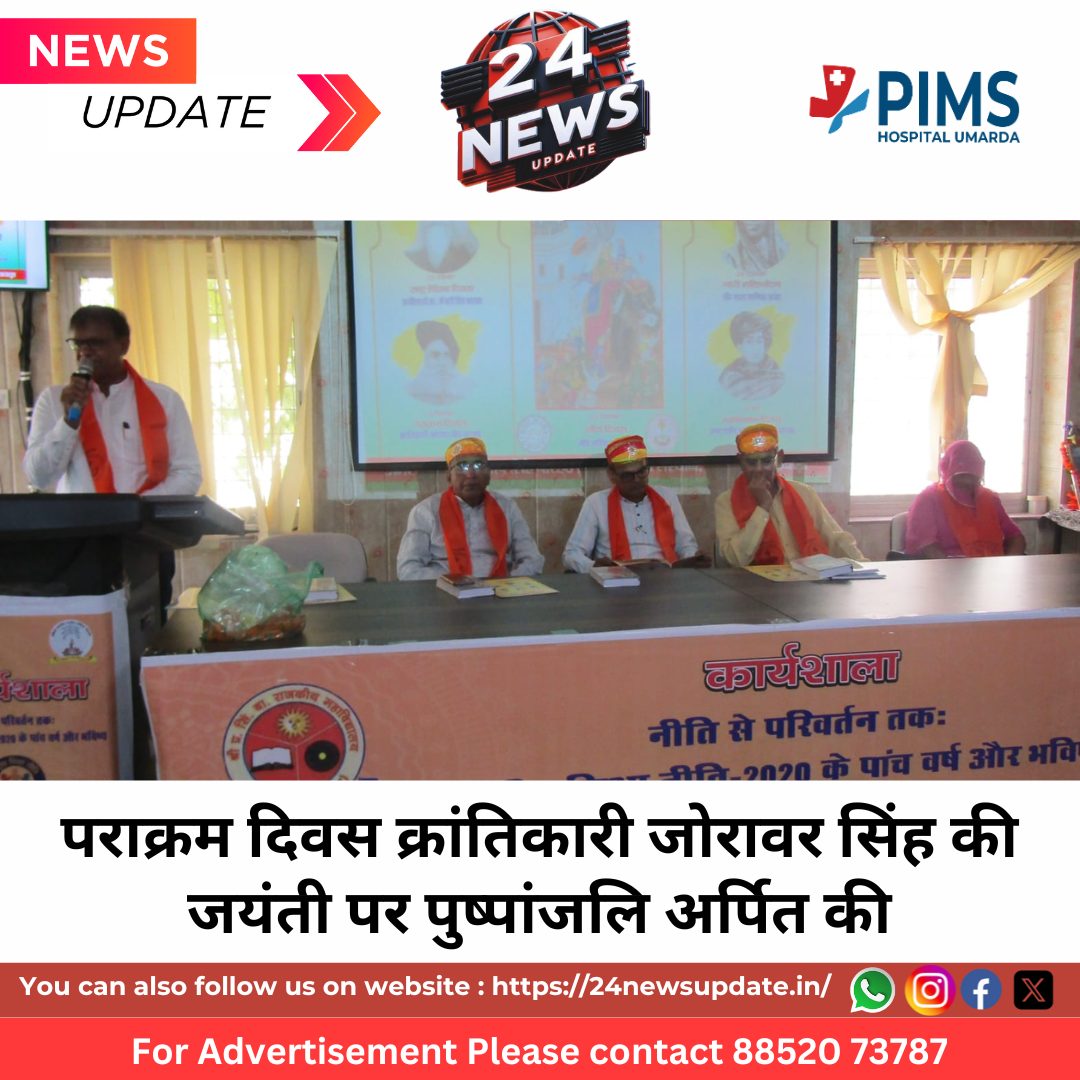 24 News Update शाहपुरा. शाहपुरा उपखंड जिला मुख्यालय के राजस्थान के वीर शिरोमणि अमर शहीद क्रांतिकारी ठाकुर जोरावर सिंह बारहठ की जयंती को पराक्रम दिवस पर महाविद्यालय एवं त्रिमूर्ति स्मारक देव खेड़ा विद्यालय में प्रतिमा पर पुष्पांजलि अर्पित की एवं क्रांतिकारीयो के 24 मार्च को स्वाभिमान दिवस 21 नवंबर को राष्ट्रचिंतन दिवस 23 दिसंबर को शौर्य दिवस 4 दिसंबर को नारी शक्ति वंदन दिवस एवं 12 सितंबर को पराक्रम दिवस के रूप में कार्यक्रम आयोजित किये जाएंगे जानकारी के अनुसार बसंत वैष्णव ने बताया कि शाहपुरा क्षेत्र के देव खेड़ा गांव में12 सितंबर1883 को जन्मे क्रांतिकारी जोरावर सिंह बारहट कीआज शुक्रवार को श्री प्रताप सिंह बारहठमहाविद्यालय एवं देव खेड़ा में ठाकुर केसर सिंह उच्च प्राथमिक विद्यालय में 143वी जयंती पर क्रांतिकारी एवं शहीदों को याद करते हुए मातृभूमि के जयकारों के साथ पुष्पांजलि अर्पित कर मनाया एवं संस्था के सदस्यों का सम्मान किया गया इस मौके पर वीर रस की कविताओं के साथ वीर गाथाओं का विस्तृत वर्णन मंच के माध्यम से वक्ताओं ने किया एवं दिल्ली में 22 दिसंबर को लॉर्ड होर्डिंग पर बम फेंकने की ऐतिहासिक एवं क्रांतिकारी घटना का स्मरण किया गया कार्यक्रम में कन्हैयालाल धाकड़ सत्यनारायण कुमावत पुष्कर राज मीणा हरमल रेबारी बारह परिवार की सरला कंवरआदि प्रबुद्ध जन मंचासीन रहे कार्यक्रम समाप्त होने पर प्रहलाद संनाढय नामक वरिष्ठ जन ने आक्रोशित होकर कहा कि महाविद्यालय एवं विद्यालय के कर्मचारी सरकार से मोटीतनखा लेने के पश्चात भी ड्यूटी वक्त में कार्यक्रम में बिना अवकाश लिए आए और राष्ट्र एवं विद्यार्थियों की शिक्षा का नुकसान किया जिन्हें समिति के सदस्यों ने समझाइस की कार्यक्रम के इस मौके पर अतिरिक्त पुलिस अधीक्षक राजेश आर्य बसंत वैष्णव कैलाश जाड़ावत परमेश्वर कुमावत देवीलाल बेरवा हंसराज जाट हरकचंद शर्मा जगदीश पारीक, रामप्रसाद सेन, बसन्त वैष्णव, कैलाश मेहडू, बरदू जाट, माधव दास, हंसराज जाट, कैलाश चारण, मोहन कोली, सत्यानाराण सेन, पवन कुमार बांगड तथा महाविद्यालय परिवार के सदस्य डाॅ. ऋचा अंगिरा, डाॅ. हंसराज सोनी, प्रो. दिग्विजय सिंह मूलचंद खटीक आदि महाविद्यालय के व्याख्याता एवं विद्यार्थी आमजन प्रबुद्ध जन मौजूद रहे