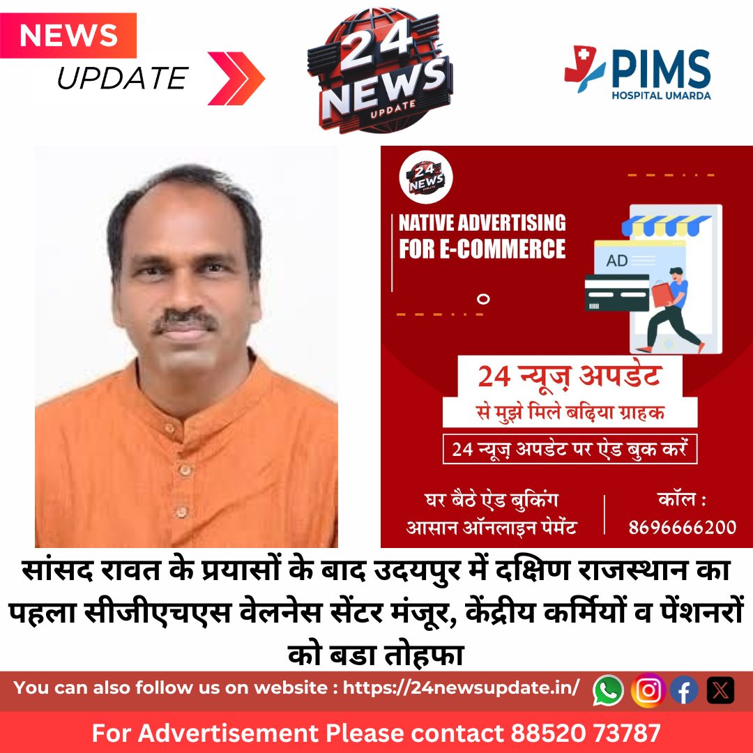 24 News Update उदयपुर। केंद्र सरकार ने उदयपुर संभाग के केंद्रीय कर्मचारियों एवं पेंशनरों के लिए बड़ा तोहफा दिया है। सांसद डॉ मन्नालाल रावत द्वारा किए गए प्रयासों के बाद दक्षिण राजस्थान का एकमात्र सीजीएचएस वेलनेस सेंटर उदयपुर में खोलने की स्वीकृति हो गई है। उदयपुर मे सीजीएचएस वैलनेस सेंटर के आदेश प्राप्त हो गए जिससे 17 हजार से अधिक परिवारों को लाभ होगा।