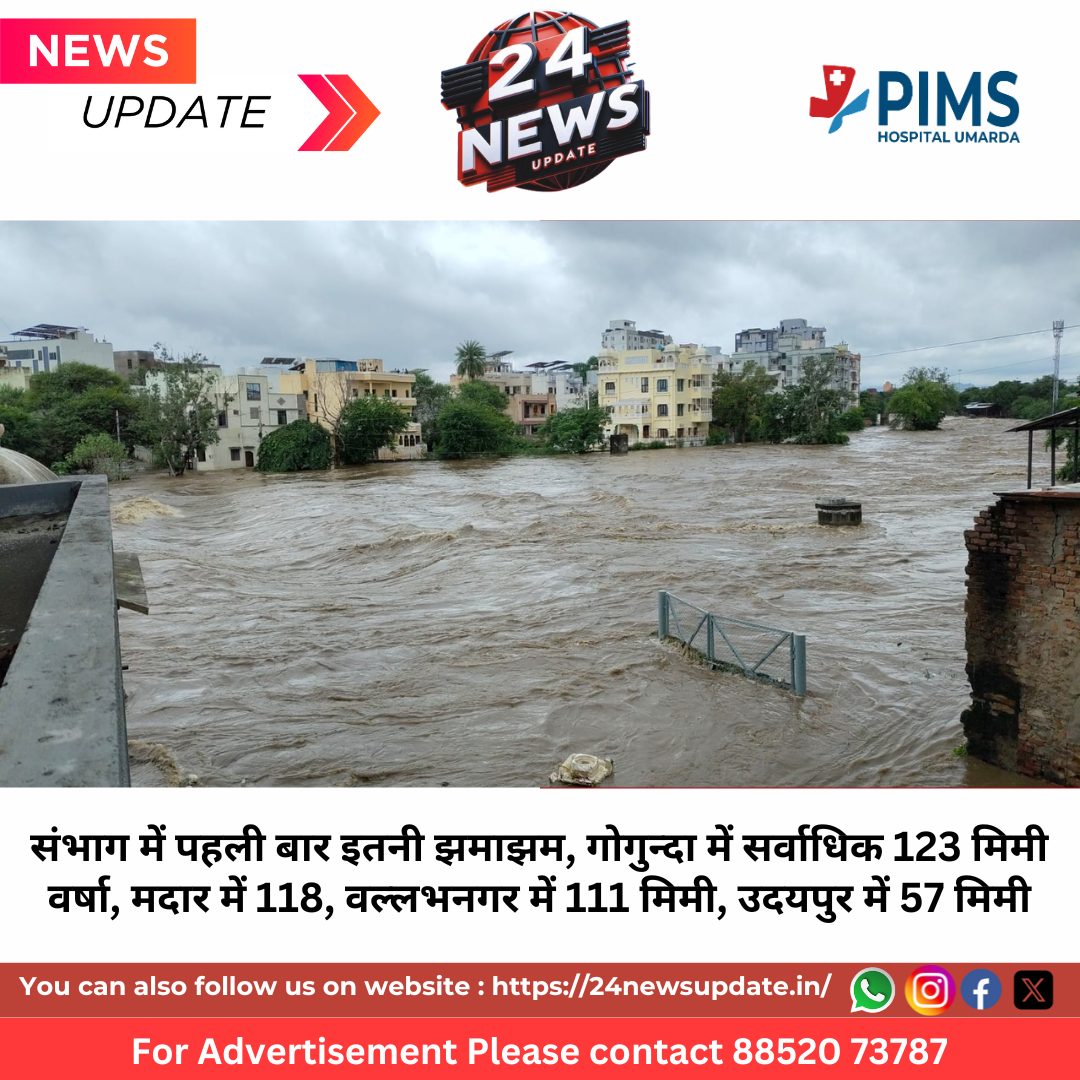 24 News Update उदयपुर । मानसून के सक्रिय रहने से उदयपुर संभाग में शनिवार को भी झमाझम बारिश का दौर जारी रहा। जिले के विभिन्न इलाकों में सुबह से रुक-रुककर हुई वर्षा से जलाशयों का जलस्तर बढ़ा और मौसम सुहावना हो गया। सबसे ज्यादा गोगुन्दा में 123 मिमी बारिश दर्ज की गई।