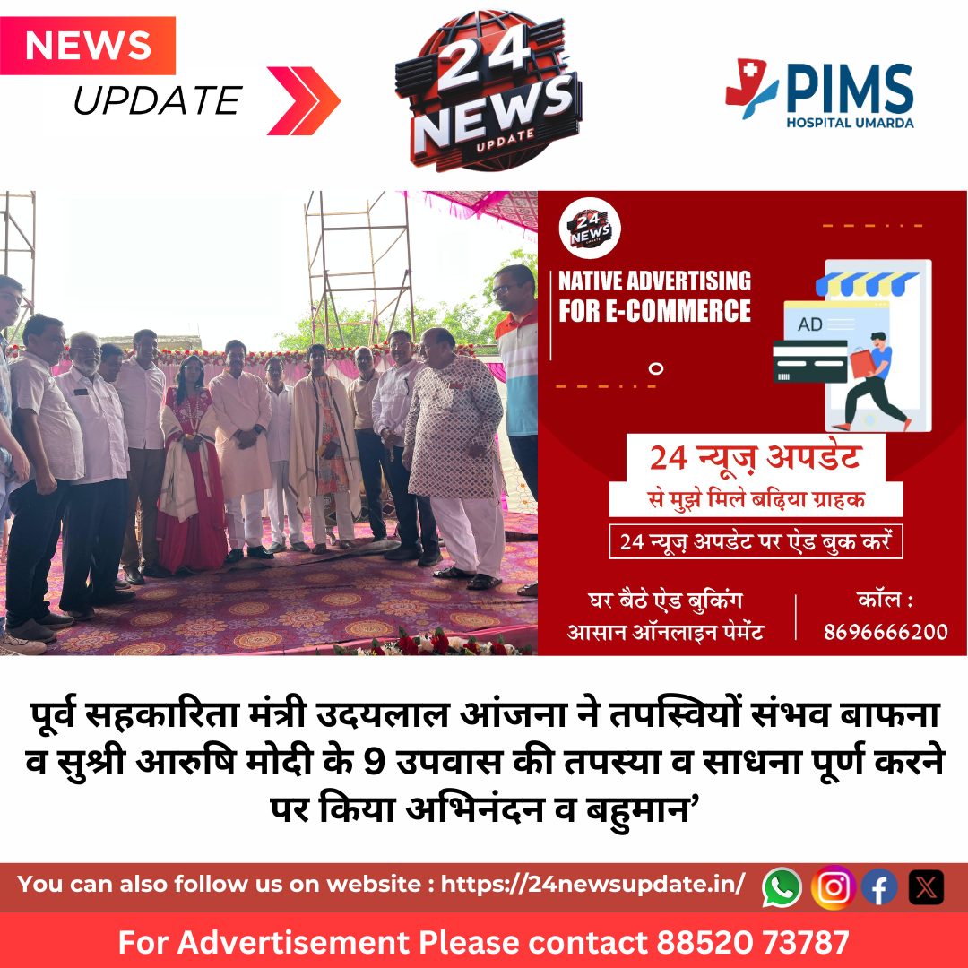 24 News Update निंबाहेड़ा कविता पारख। राजस्थान सरकार के पूर्व सहकारिता मंत्री उदयलाल आंजना ने संभव बाफना पुत्र गौरव बाफना एवं सुश्री आरुषि मोदी पुत्री राकेश मोदी दोनों ही तपस्वियों के 9 उपवास की साधना और तपस्या पूर्ण करने पर नगर के आदर्श कॉलोनी में स्थित श्री राजेन्द्रसूरी ज्ञान मन्दिर में आयोजित कार्यक्रम में तपस्वी संभव बाफना एवं सुश्री आरुषि मोदी के द्वारा की गई साधना और तपस्या पर प्रशंसा व्यक्त करते हुए पूर्व सहकारिता मंत्री उदयलाल आंजना ने संभव बाफना और सुश्री आरुषि मोदी को श्रीफल भेंट कर शॉल ओढ़ाकर और मोतियों की माला पहनाकर तपस्वियों का अभिनंदन करते हुए बहुमान किया।