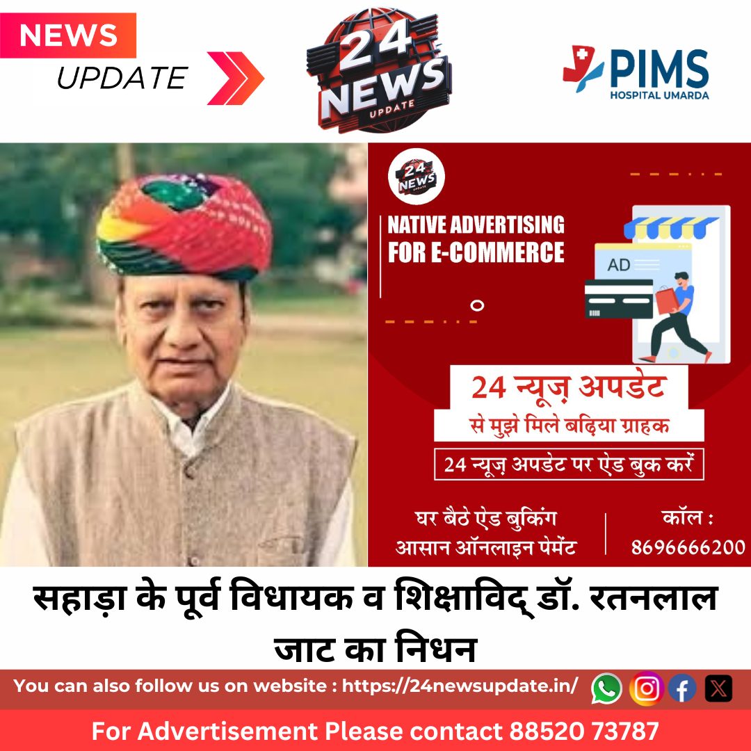 24 News Update भीलवाड़ा। सहाड़ा क्षेत्र के वरिष्ठ भाजपा नेता, पूर्व विधायक और शिक्षाविद् डॉ. रतनलाल जाट का जयपुर के एक निजी अस्पताल में आज लंबी बीमारी के बाद निधन हो गया। वे पिछले कई समय से मल्टीपल स्वास्थ्य समस्याओं से जूझ रहे थे और लगातार उपचाराधीन थे। उनके निधन से सहाड़ा क्षेत्र और शिक्षा जगत में शोक की लहर है।