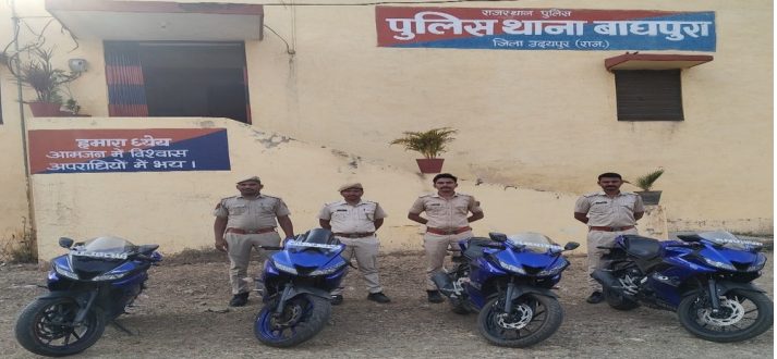 जिला पुलिस अधीक्षक श्री योगेश गोयल के निर्देश में एम.वी. एक्ट (मोटर व्हीकल अधिनियम) के तहत चलाए जा रहे विशेष अभियान के तहत बाघपुरा थाना पुलिस ने पावर बाइक पर स्टंट करते हुए चार बाइकर्स को दबोचा है। सभी पावर बाइकों को डिटेन कर अग्रिम कार्यवाही की जा रही है।