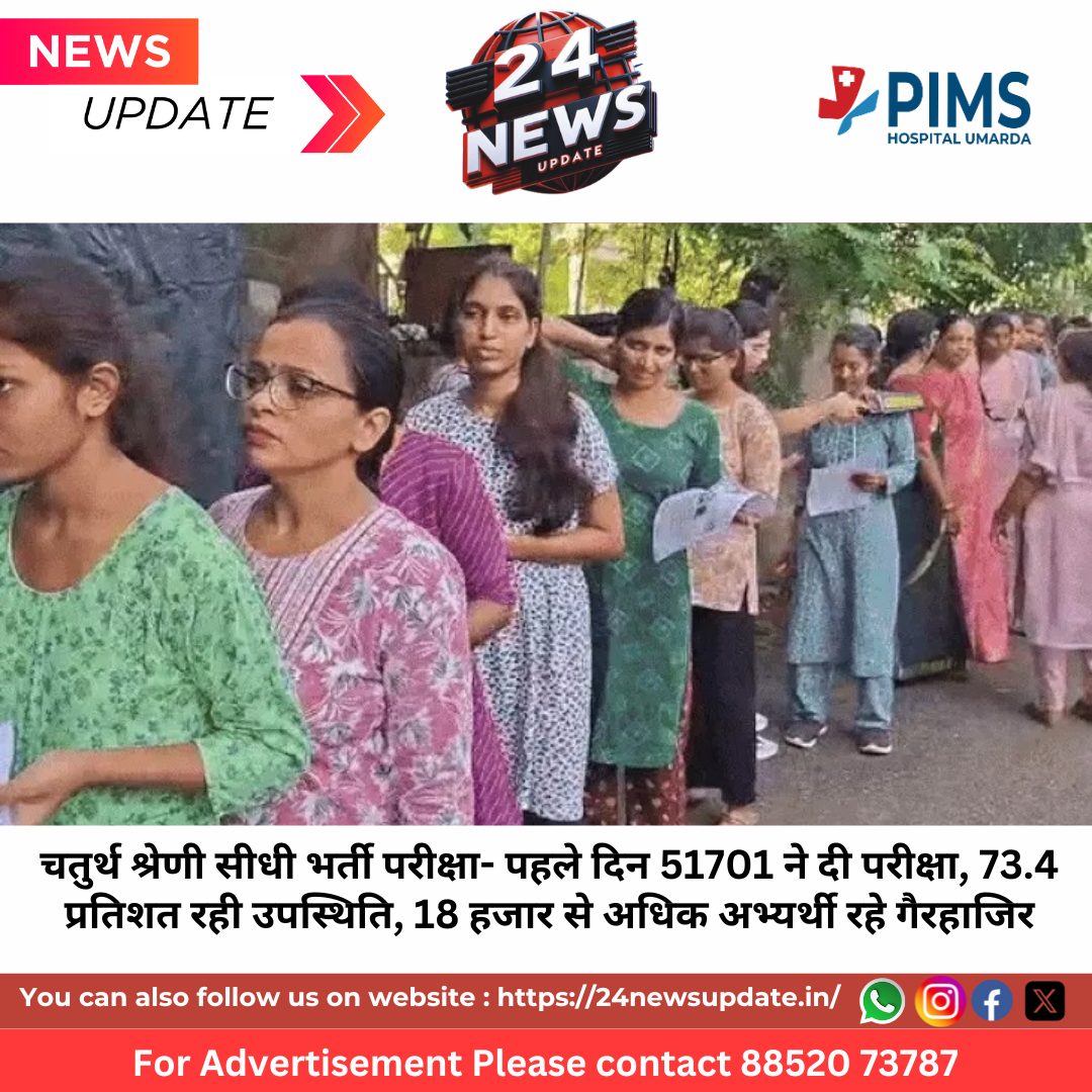 24 News Update उदयपुर। राजस्थान कर्मचारी चयन बोर्ड के तत्वावधान में प्रदेश भर में शुक्रवार से चतुर्थ श्रेणी सीधी भर्ती परीक्षा प्रारंभ हुई। उदयपुर में पहले दिन दो पारियों में 51701 अभ्यर्थियों ने परीक्षा दी। परीक्षा समन्वयक एवं एडीएम प्रशासन दीपेंद्रसिंह राठौड़ ने बताया कि जिला कलक्टर नमित मेहता के निर्देशन में उदयपुर में तीन दिवसीय परीक्षा शांतिपूर्ण ढंग से प्रारंभ हुई। जिले में 112 केंद्र स्थापित किए गए हैं। सुबह 10 से 12 बजे तक हुई पहली पारी में 35220 अभ्यर्थियों में से 25795 उपस्थित रहे, वहीं 9425 की अनुपस्थिति दर्ज की गई। अपराह्न 3 से 5 तक हुई द्वितीय पारी में 35215 में से 25906 अभ्यर्थी उपस्थित रहे। दूसरी पारी में 9309 अभ्यर्थी गैरहाजिर रहे। इस प्रकार दोनों पारियों में औसतन 73.4 प्रतिशत उपस्थिति दर्ज की गई। श्री राठौड़ ने बताया कि 20 सितम्बर को भी दोनों पारियों में क्रमशः 35214 एवं 35216 तथा 21 सितम्बर को क्रमशः 35215 एवं 35221 अभ्यर्थी परीक्षा देंगे। Share this: Share on X (Opens in new window) X Share on Facebook (Opens in new window) Facebook More Email a link to a friend (Opens in new window) Email Share on WhatsApp (Opens in new window) WhatsApp Like this:Like Loading... Related Discover more from 24 News Update Subscribe to get the latest posts sent to your email. Type your email… Subscribe Post navigation मीनाक्षी मंडोवरा को मिली पीएचडी की उपाधि लेक सिटी में उदयपुर इन्वेस्टमेंट गेटवे की पहल, 15 स्टार्टअप्स दिखाएंगे आइडिया, मिलेगा मेंटरशिप और फंडिंग का अवसर