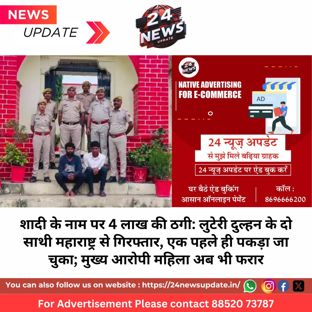24 News Update डूंगरपुर, शादी करवाने के नाम पर चार लाख रुपये की ठगी कर फरार हुई लुटेरी दुल्हन गिरोह के दो सदस्यों को डूंगरपुर जिले की धंबोला थाना पुलिस ने महाराष्ट्र से गिरफ्तार कर लिया है। इस मामले में एक अन्य आरोपी पहले ही गिरफ्तार किया जा चुका है, जबकि मुख्य आरोपी महिला – जो शादी कर युवक को छोड़कर फरार हो गई – अब भी पुलिस की गिरफ्त से बाहर है।