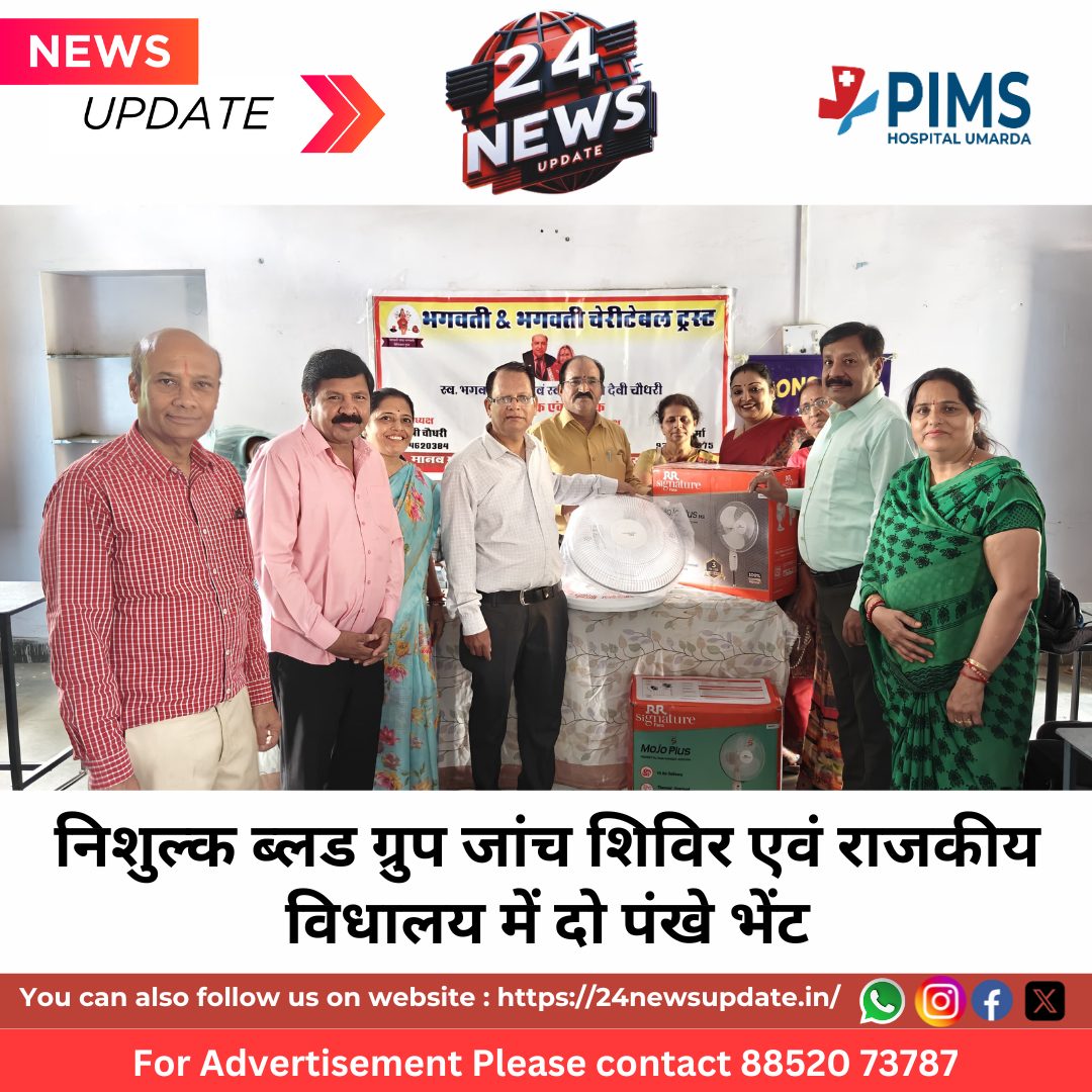 24 News Update उदयपुर। भगवती एंड भगवती चैरिटेबल ट्रस्ट और लायंस क्लब मेवाड़ गौरव के संयुक्त तद्भावधान में राजकीय आदर्श वरिष्ठ उपाध्याय संस्कृत विद्यालय, सवीना खेड़ा के सभी विद्यार्थियों एवं अध्यापकों सहित 192 लोगों का निशुल्क ब्लड ग्रुप जांच की गई एवं ट्रस्ट संस्थापक स्वर्गीय भगवती लाल चौधरी और भगवती देवी चौधरी की पुण्य स्मृति में विधालय में दो पंखे भेंट किए गए । मीडिया प्रभारी नरेश पूर्बिया ने बताया कि अध्यक्ष गायत्री चौधरी, उपाध्यक्ष योगेश चौधरी, कोषाध्यक्ष उपेंद्र चौधरी, कैलाश चौधरी, सह सचिव चंद्रकला चौधरी, सह कोषाध्यक्ष रेनू चौधरी, सचिव भूपेंद्र शर्मा, नरेश पूर्बिया, पिनू चौधरी, दीपक चौधरी, ग़ौरी चौधरी, सरिता, विकास सहित बड़ी संख्या में ट्रस्ट सदस्य उपस्थित थे। प्रधानाचार्य डॉ भगवती शंकर व्यास ने आभार व्यक्त किया ।